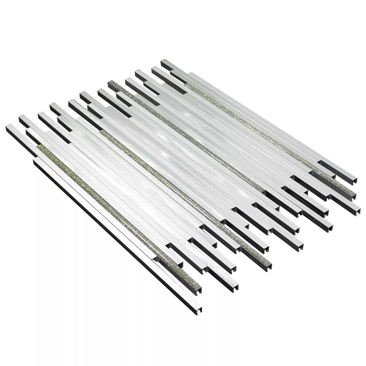 The aluminum metal mosaic tiles Bilbao in stick shape gives your interior a contemporary aesthetic. With a surface in a brushed metal look and a matt texture, they radiate elegance. The silver color and the stone size of 7.5x300mm offer unique accents.