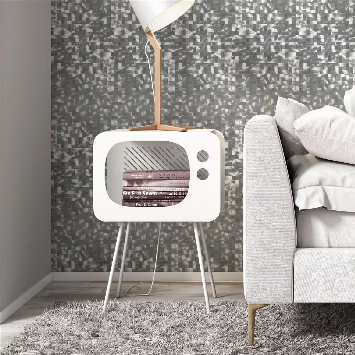 The Quantum Silver mosaic tiles made of aluminum and metal give your rooms a contemporary elegance. The unusual composite format and brushed surface create a unique look.
