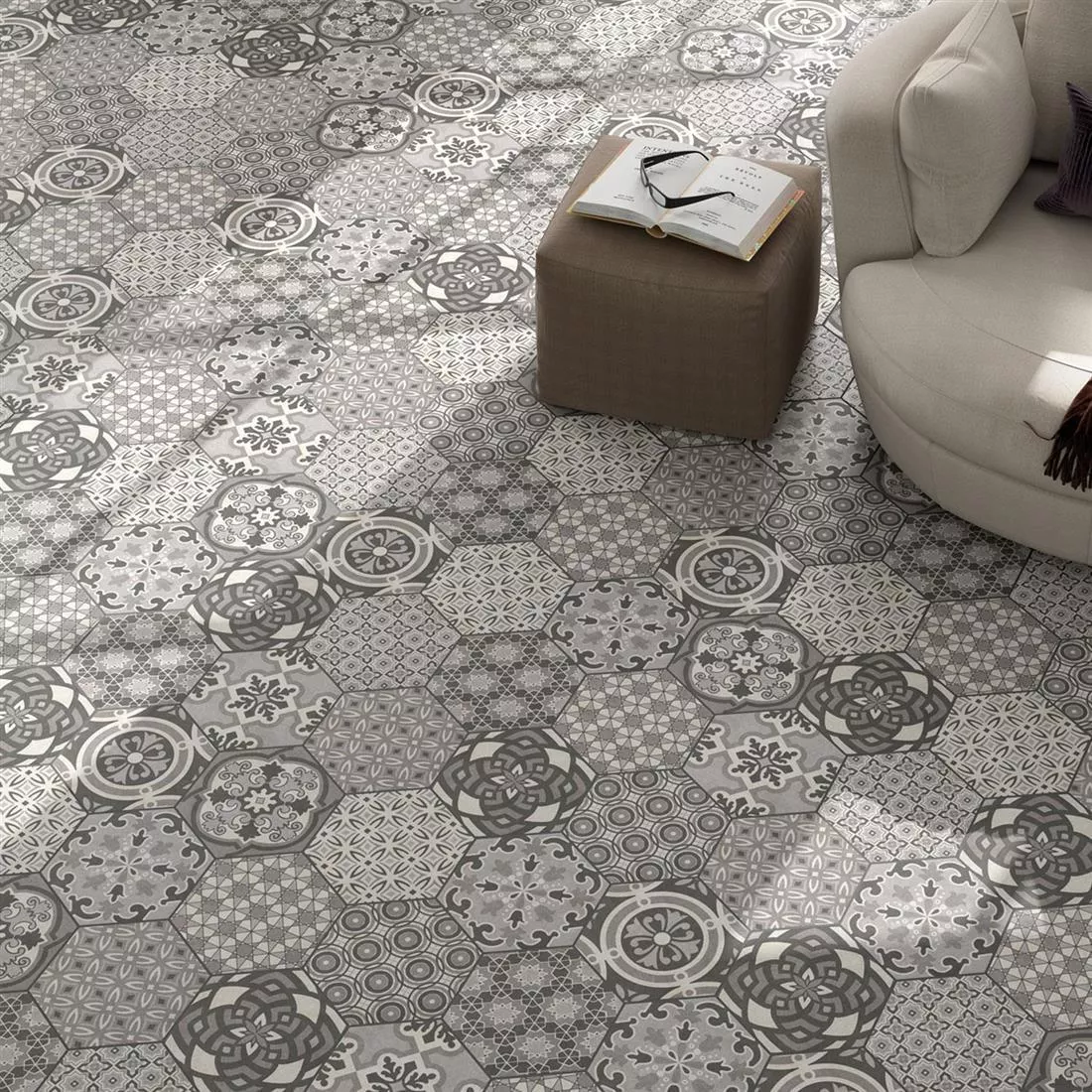 The modern cement tiles with the ingeniously designed Hexagon Alicante look delight young and old alike with a delicate shade of gray and many different patterns on the hexagons of the floor tiles. Wall tiles in different shades of gray can be ideally combined with these tiles. The modern hexagon tiles conjure up an exciting moment in every room, which will fascinate all members of the family for many decades. The fine cement tiles with the trendy hexagon look from the Alicante series can always be supplemented with a different furnishing style. Thanks to the timeless design of the hexagonal floor tiles, these floors tiled with the Alicante series emphasize both warm country-style furniture and cool designer furniture. Instead of gray wall tiles, light wallpaper can also be chosen for the fine hexagonal tiles. Both a small and a high tile backsplash on the wall can be added to the robust cement tiles with the Alicante hexagon look at any time.