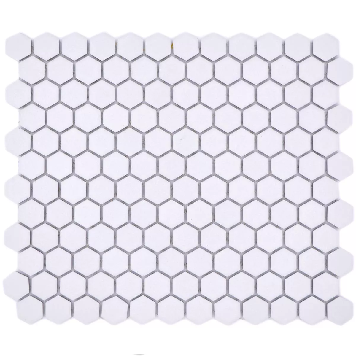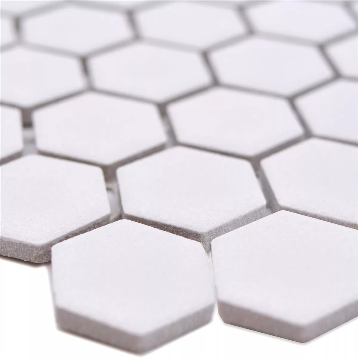 The ceramic mosaic tile in white is 5 mm thick. The individual tiles are neatly glued to mats and can easily be put together to form a decorative mosaic. The matt surface is insensitive to dirt and, if necessary, can be cleaned quickly and easily with simple, neutral cleaning agents, for example with a little washing-up liquid. The tile ceramic mosaic Bismarck R10B Hexagon is assigned to slip resistance class R10B and abrasion class 4. The hexagon tile is suitable for floors in wet rooms, for example bathrooms.