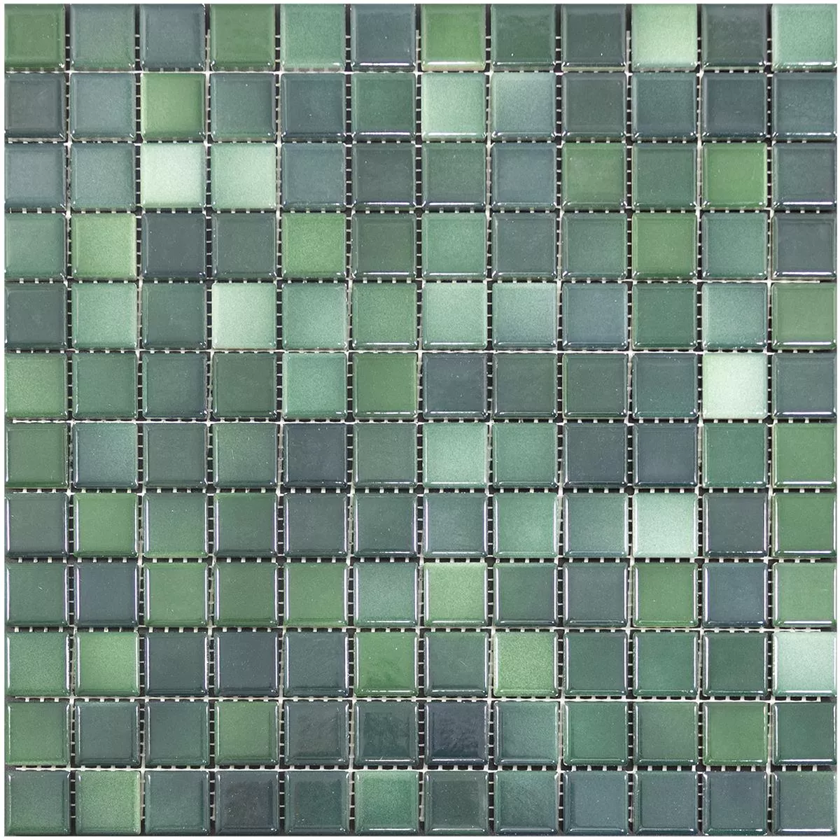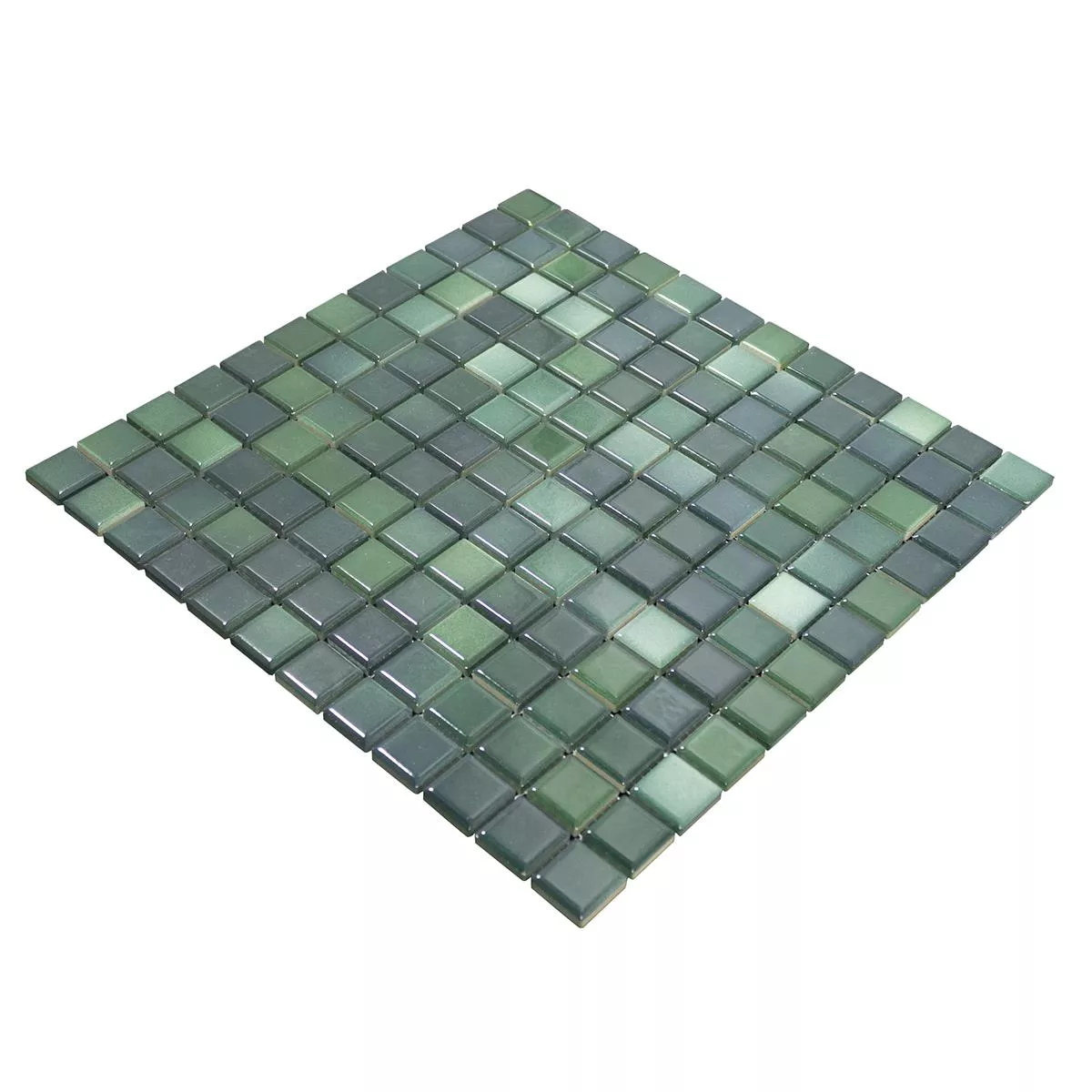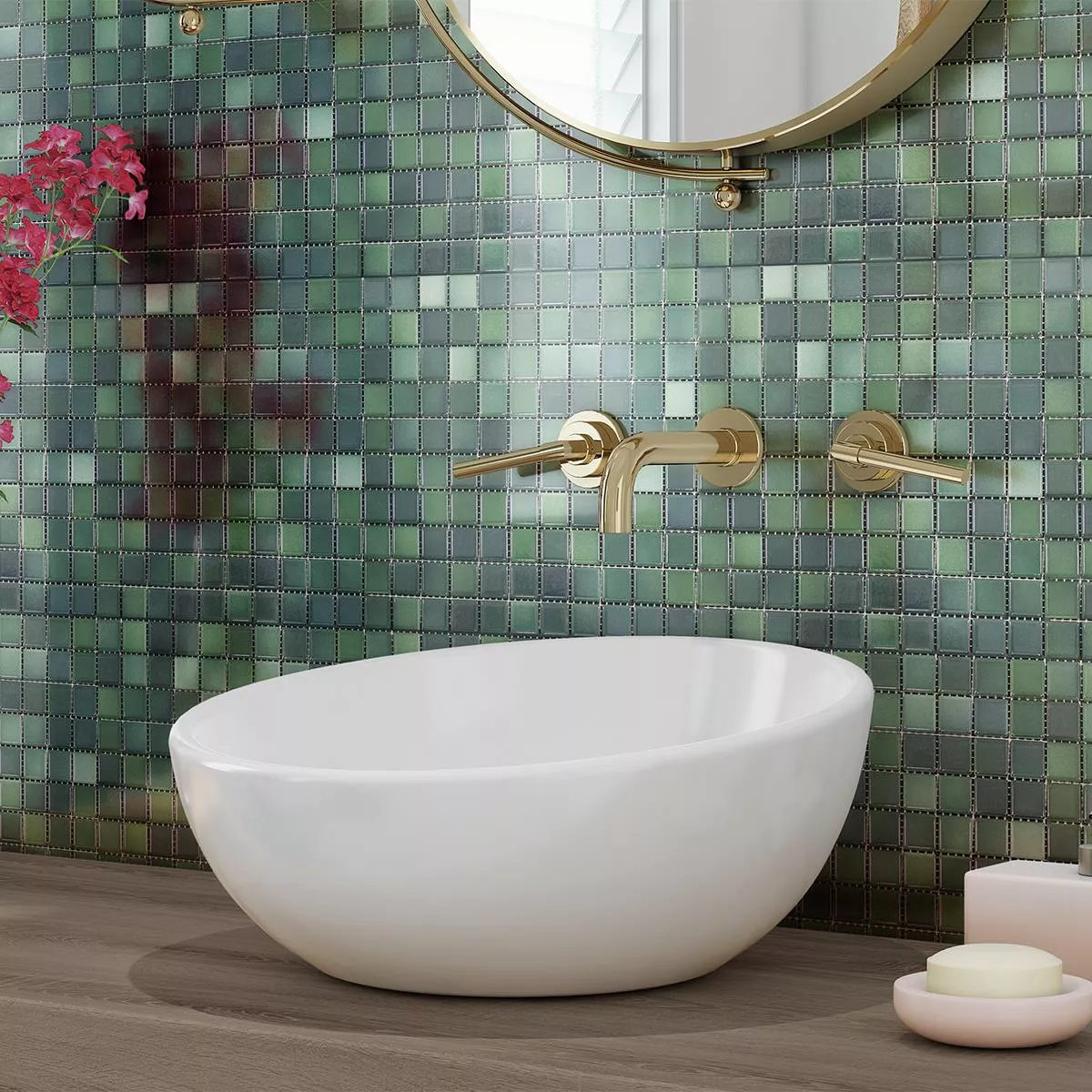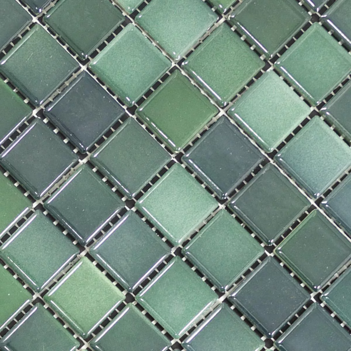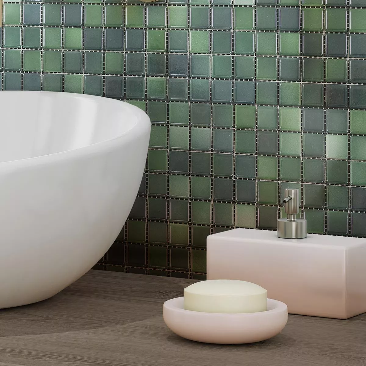 The Galleria ceramic mosaic tile in a refreshing green mix brings a unique flair to your rooms with its elegant metallic look and matte surface. With the stone size of 23 x 23 mm and the tile mat of 29.7 x 29.7 cm, which is already glued to a net ready for installation, installation on both walls and floors becomes a simple and precise task.