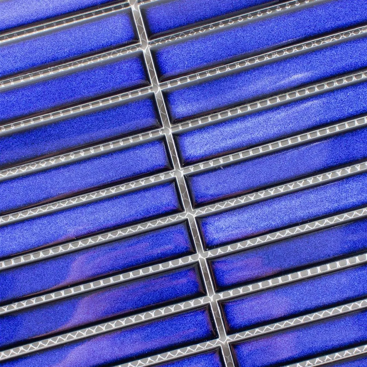 Each individual stone has a format of 22x145 mm and a thickness of 7.5 mm, which gives the tile a slim, rod-like and rectangular shape. The tiles are arranged on mats that are 29.6x30 cm in size and cover an area of 0.088 m². The rectangular shape in combination with the subtle blue color makes these tiles ideal for creative and modern design concepts.