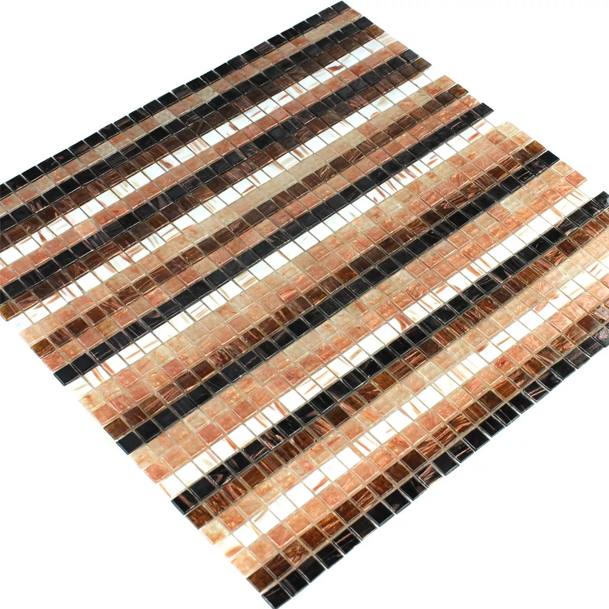 This glass mosaic in different alternating colors is ideal for creative design and decorative wall cladding, so individual design options are possible in bathrooms, kitchens, swimming pools, on columns and in the wellness area. It is glued to a net, so it can be easily processed and individually cut.