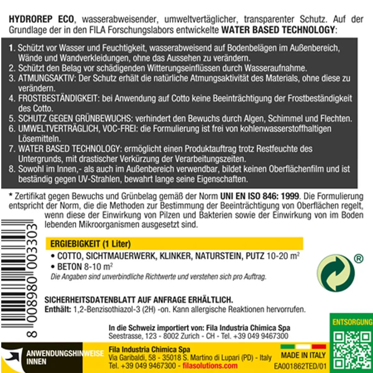 It is recommended to test the product on a test surface to check for possible color changes. Avoid pooling of unabsorbed product. Do not apply the product outdoors if the weather forecast predicts rain. Any stubborn product residues can be removed after the product has dried using FASEZERO diluted 1:10 and a single-disc machine with a white pad. If possible, do not use the product on surfaces with dew or in direct sunlight. Does not protect against aggressive acids.
