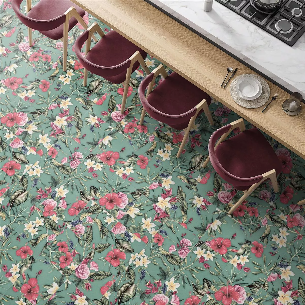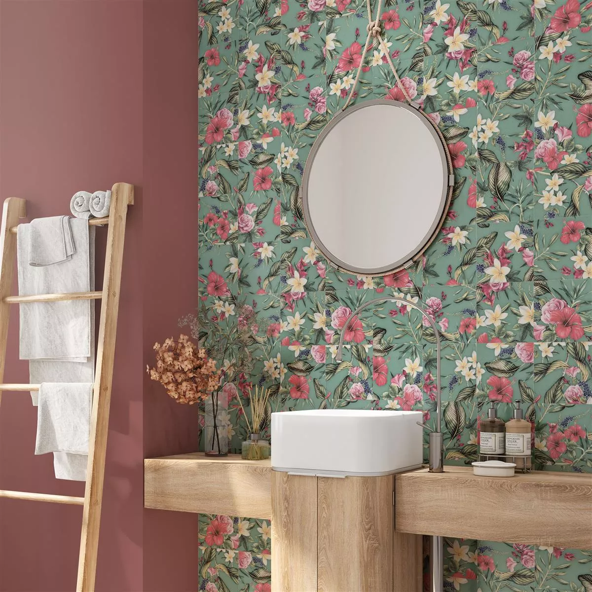 Experience the harmony of nature and elegance with our green Flowerfield tiles, which not only enchant with their floral look, but also meet the highest demands in terms of functionality. These tiles are the perfect choice for walls and floors in living rooms, kitchens and bathrooms.