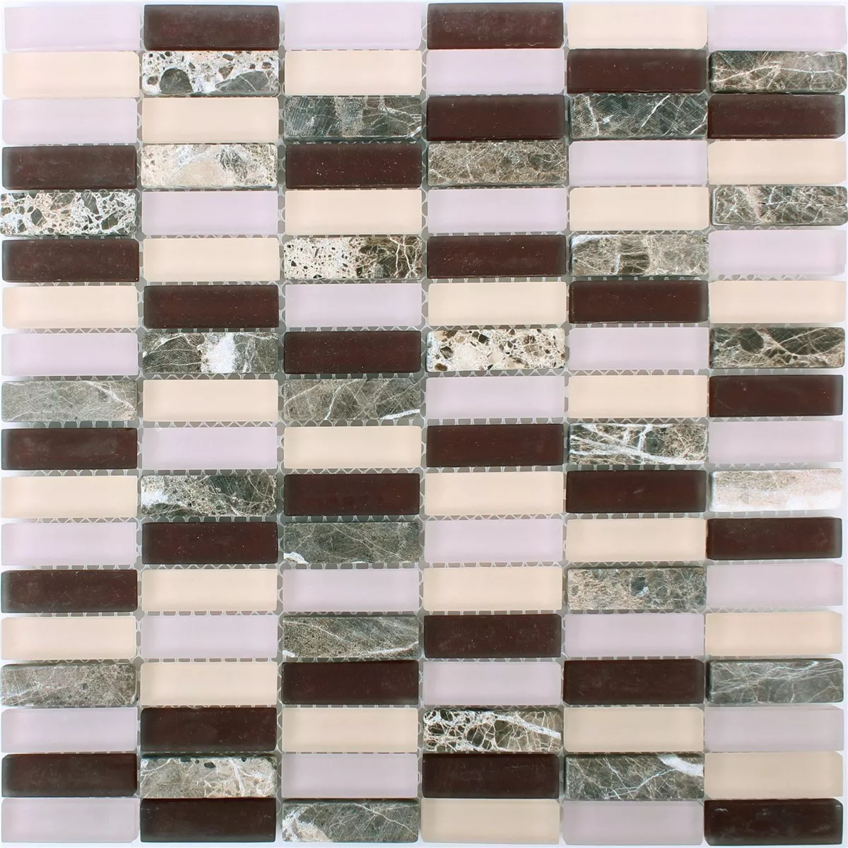 The glass mosaic natural stone tiles Conrad have stones in the colors purple, brown, beige and bordeaux. The stone size is 15x50mm. The product consists of a fascinating combination of the materials glass and natural stone. The 8mm thick stones are attached to a mat measuring 30x30cm, so that they can be laid easily and comfortably.