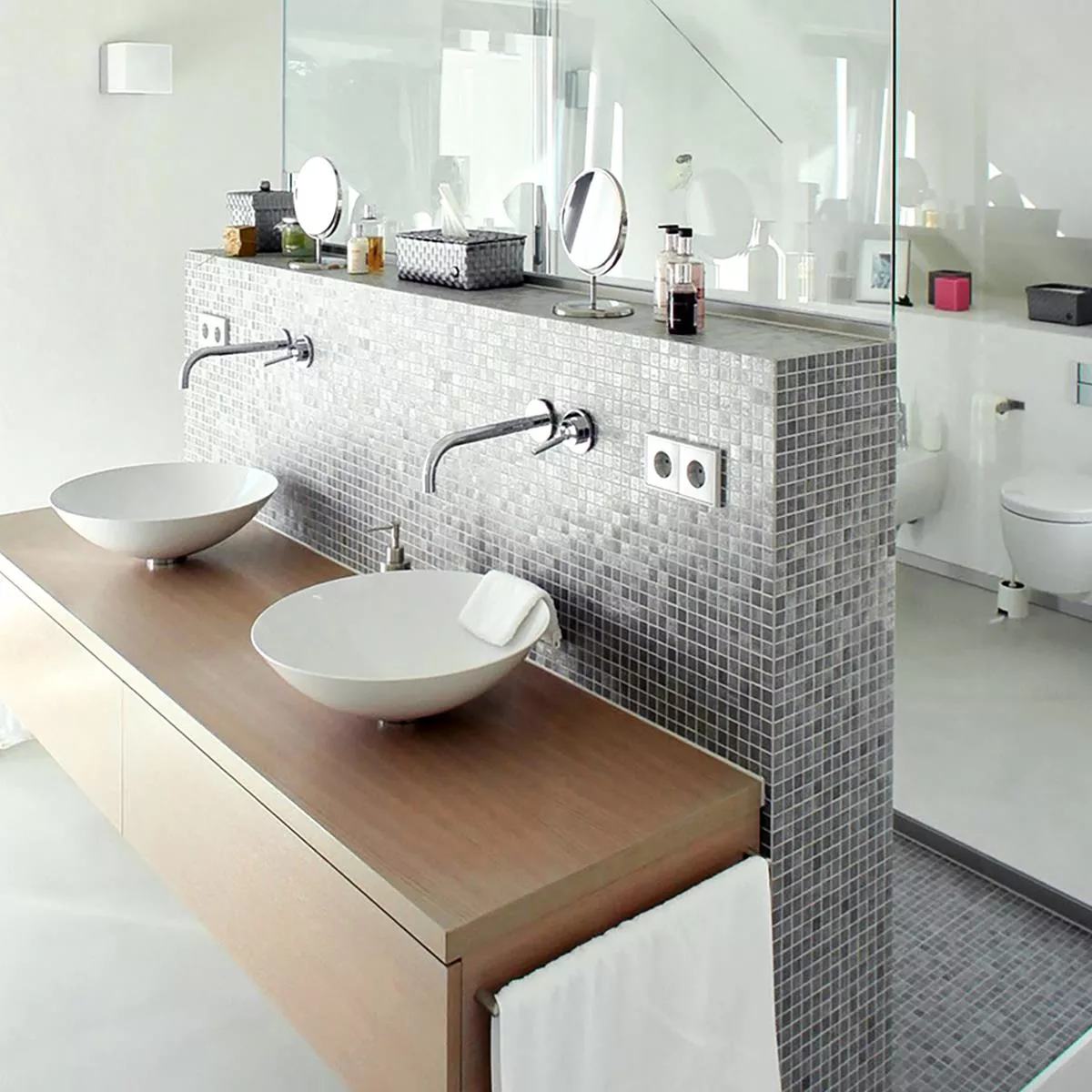 The Vitreo 153 mosaic tile in grey made of glass offers an elegant solution for many applications. It is perfect for floors and walls in kitchens, bathrooms, swimming pools, and outdoor areas. With its frost resistance, it is ideal for permanently wet areas and can be used both indoors and outdoors.