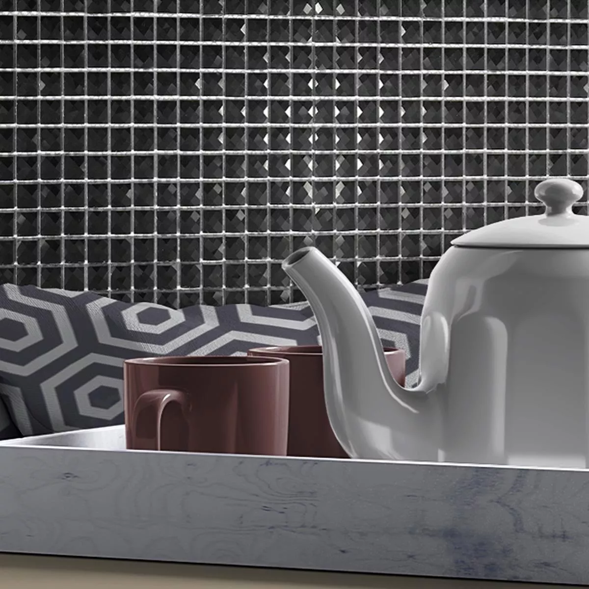 Glass mosaic tiles Black Diamond present timeless elegance. These square mosaic, wall and floor tiles with a stone size of 15x15mm give your interior a shiny, black brilliance. The special feature of being glued to a net ready for installation makes installation effortless. With a thickness of 8mm and a joint width of 2mm, they not only offer aesthetics but also frost resistance.