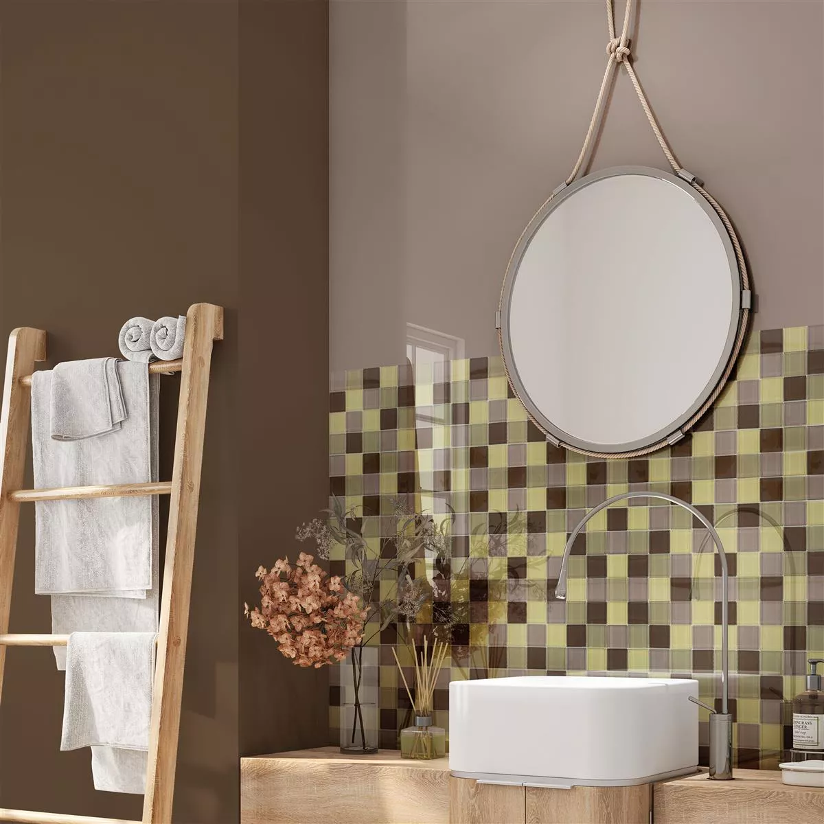 The Glasgow mosaic tile in brown mix brings warmth and elegance to your rooms with its glossy surface and tasteful color combination. This tile is versatile and is ideal for bathrooms, kitchens, interiors, living rooms and showers.