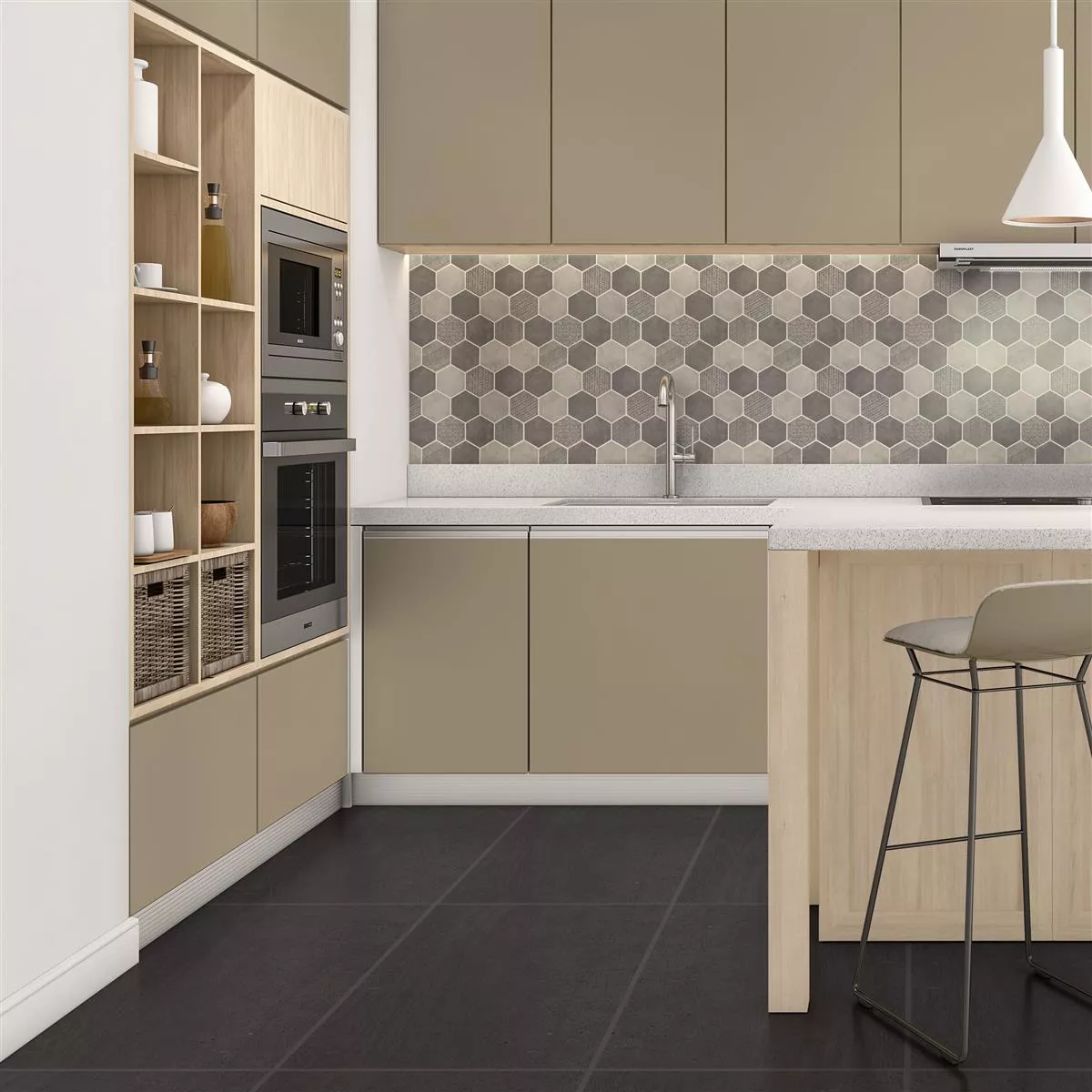 The joint width is 2mm, which contributes to a seamless and even appearance. The hexagon tile format gives the rooms a modern and attractive look.