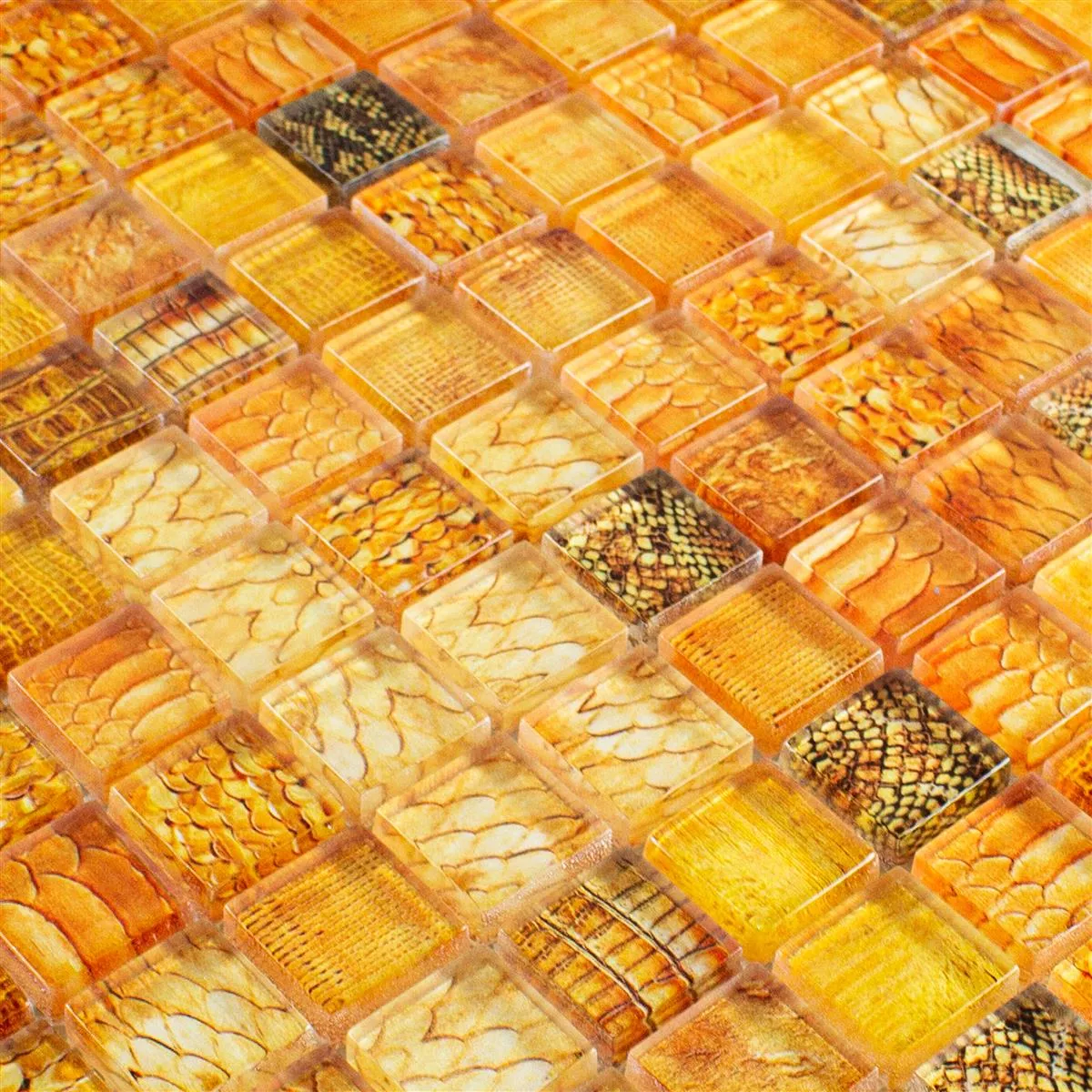 The "Python" glass mosaic tiles in vibrant orange bring dynamic energy and a touch of exclusivity to your wall design. With their glossy surface and high-quality glass stones, these mosaic tiles offer a colorful and easy-care solution for any wall.