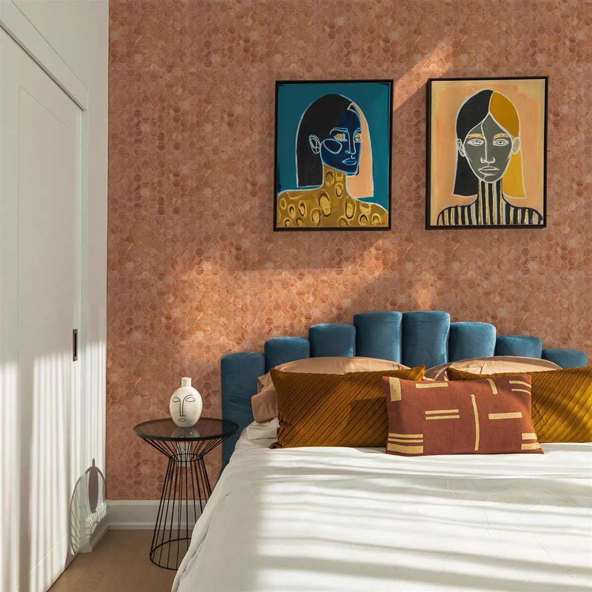 The glass mosaic tile from the Hexagonal collection is made from 59% recycled glass, a sustainable choice for your home. The back of the tiles is bonded to a polyurethane mesh, making installation much easier, whether as a wall or floor tile. Despite their robust material, these tiles can be easily installed indoors or outdoors.