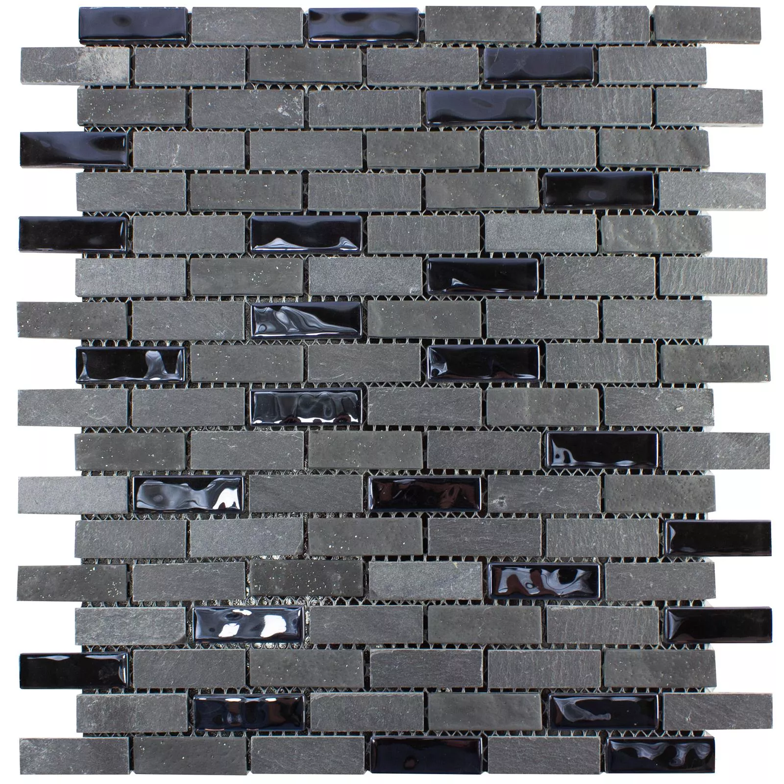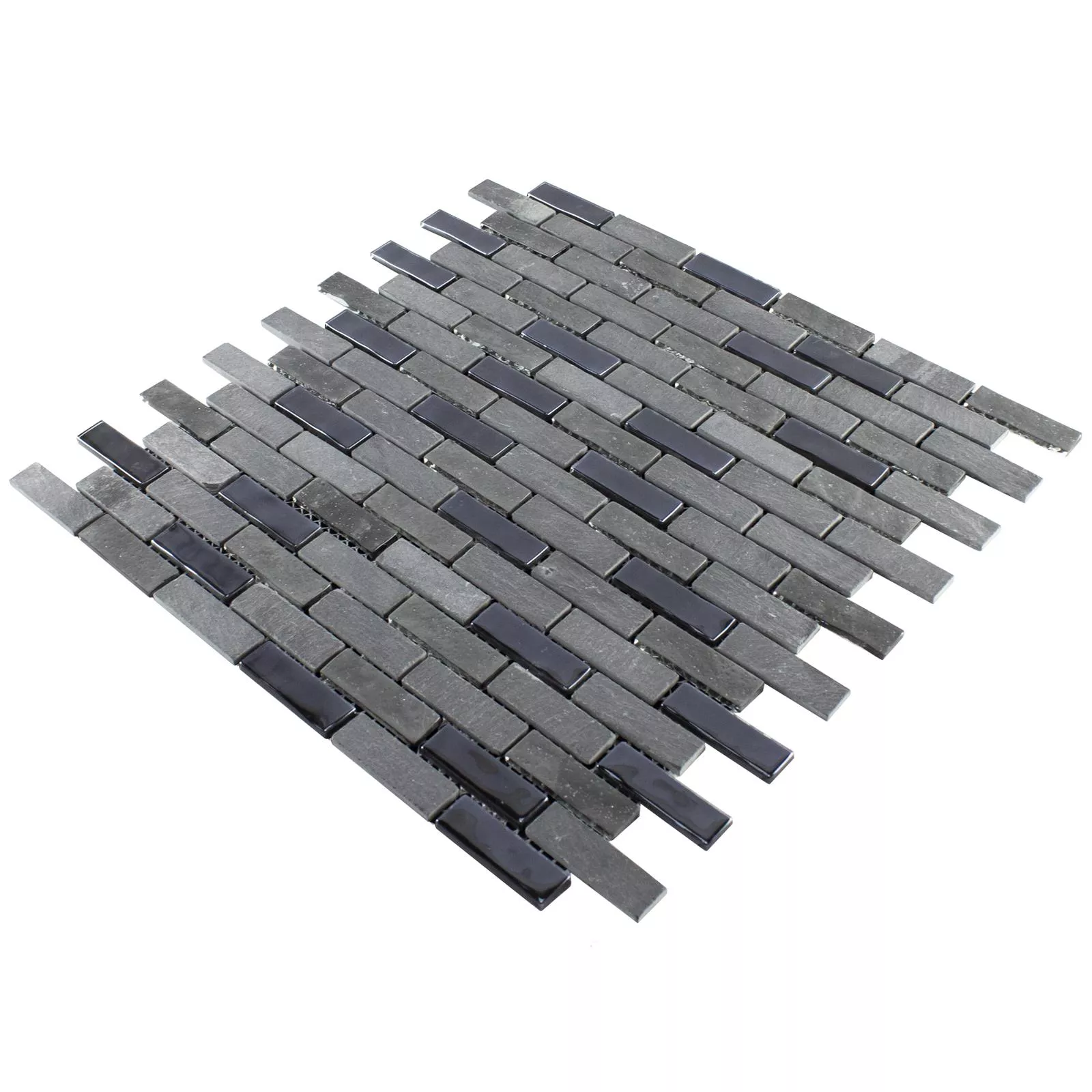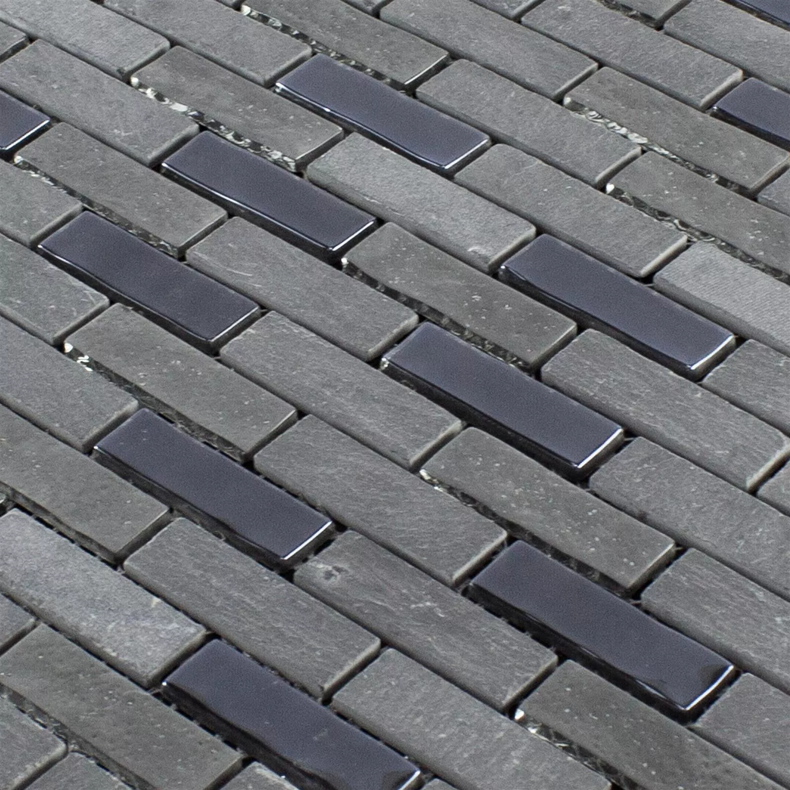 This glass natural stone mosaic is rectangular and has a black color. It is made of natural stone and glass and has a stone size of 15x48mm. The surface of the mosaic is both matte and glossy, and the mat size is 29.8x30.4cm. A mat of this mosaic has a size of 0.091m² and a thickness of 5mm. The mosaic is self-adhesive and can be used as a wall tile or a mosaic tile. It is suitable for indoor use, but cannot be used in wet areas due to its material properties. The mosaic is well suited for living rooms and kitchens.