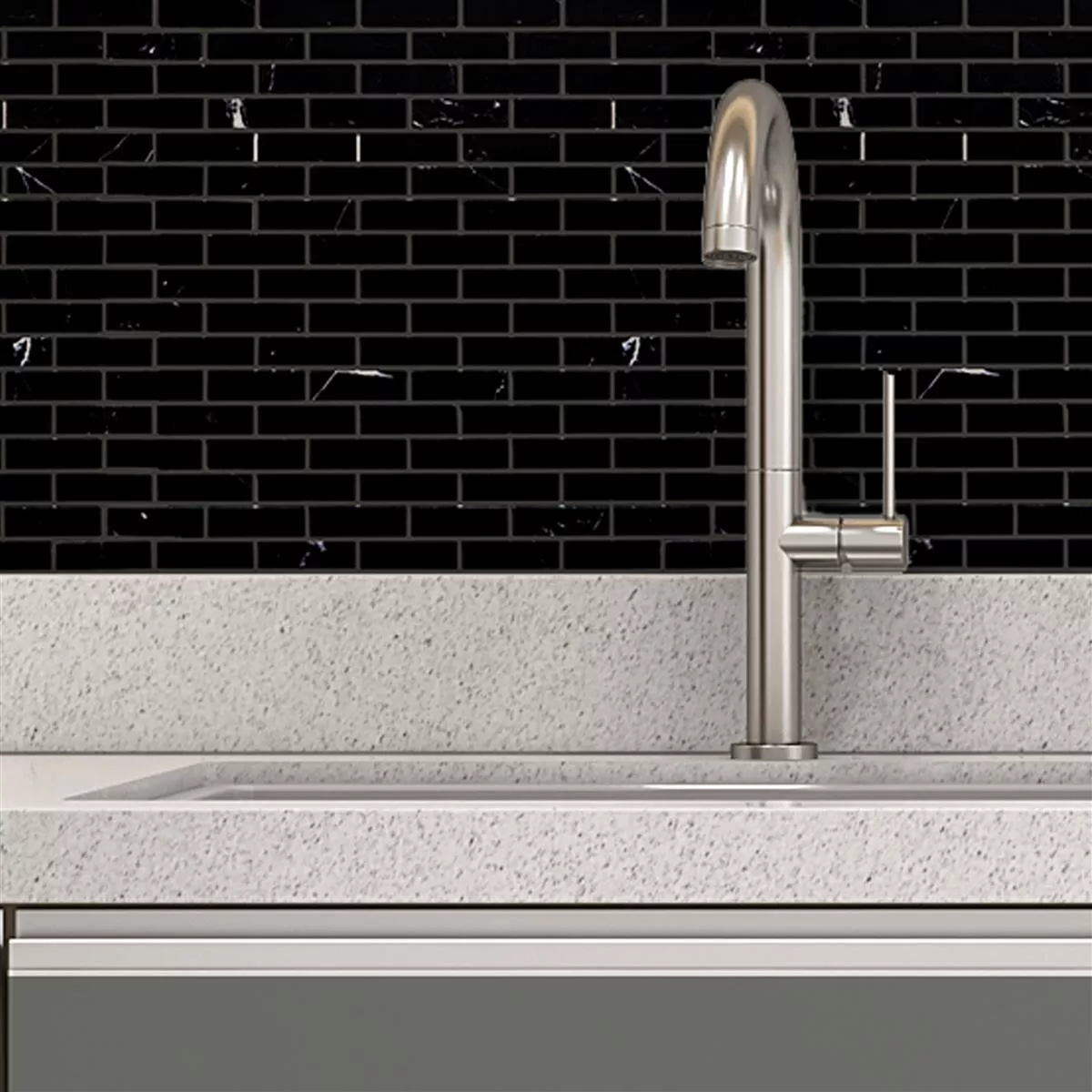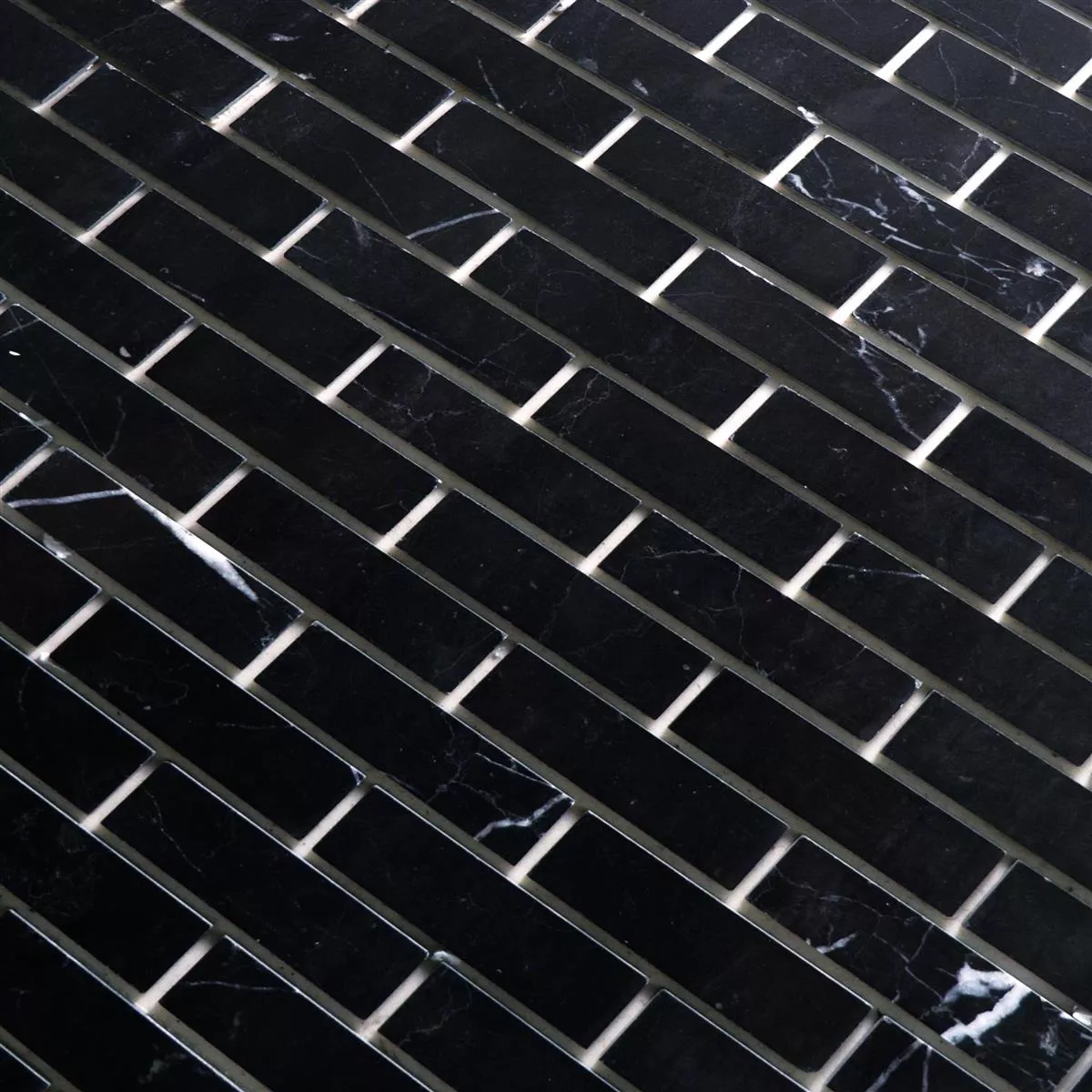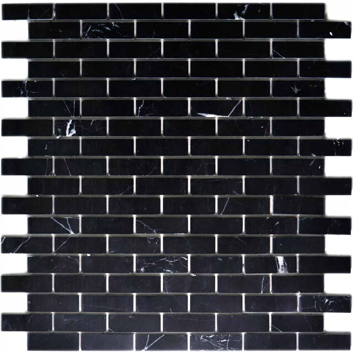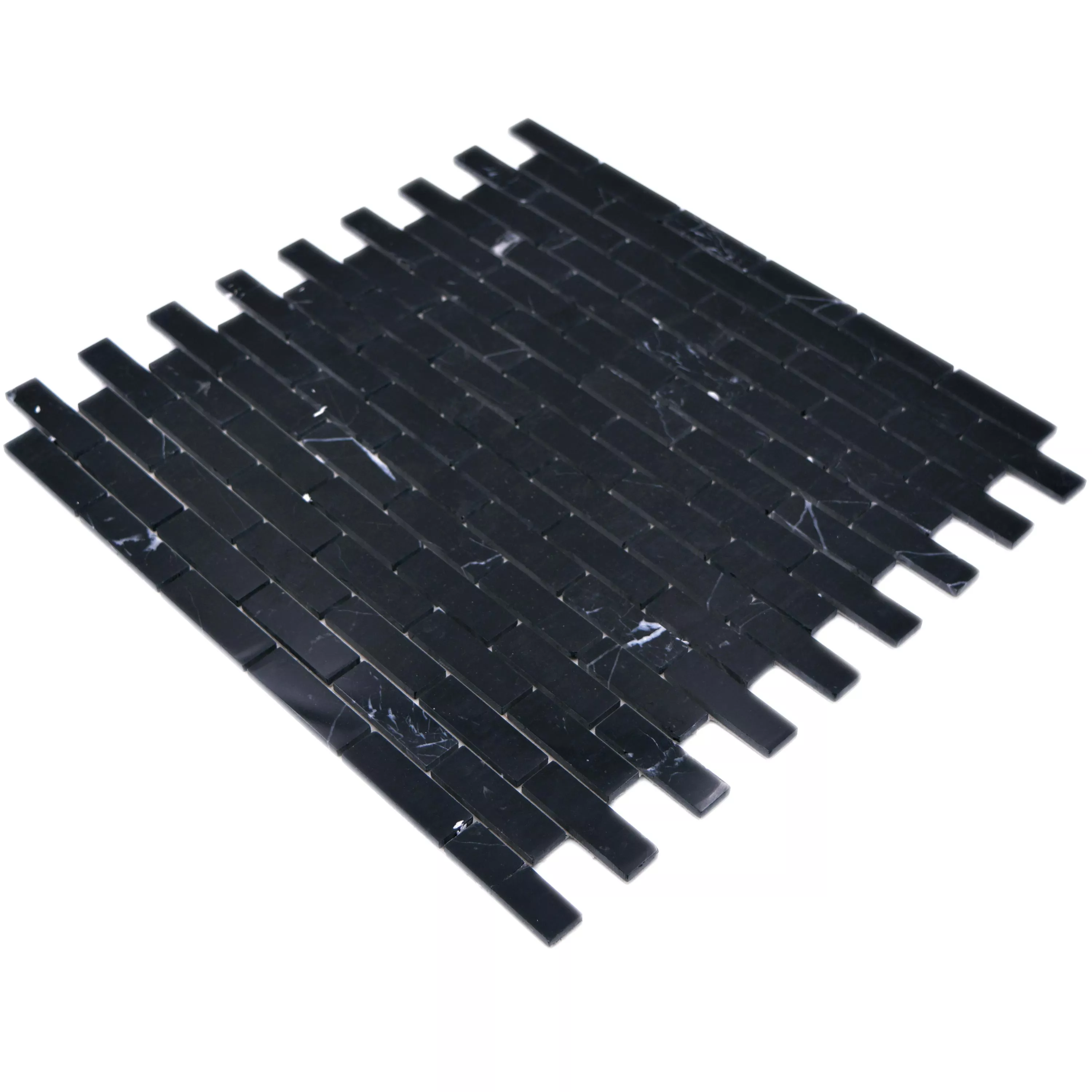 The Avalon Black marble natural stone mosaic tiles are an elegant and stylish self-adhesive wall tile that is ideal for indoor use, living rooms and kitchens. They are made of natural stone, more precisely marble, which gives them a natural and high-quality look. The tiles have a rectangular shape with the dimensions 15x48mm and a thickness of 4mm. Each mat has a size of 30x30.5cm and an area of 0.092m².