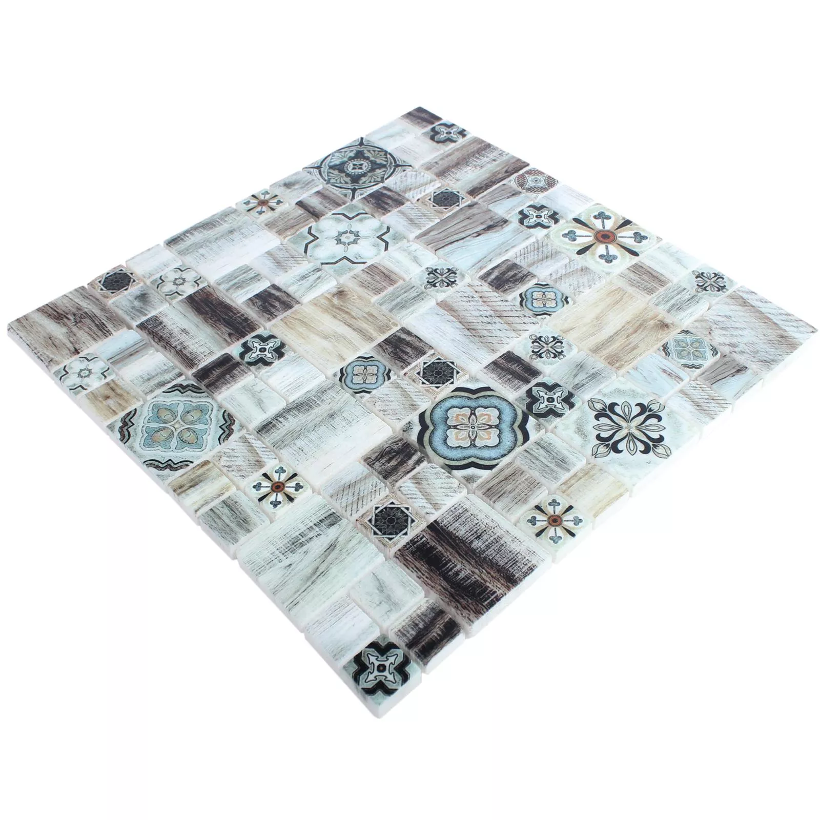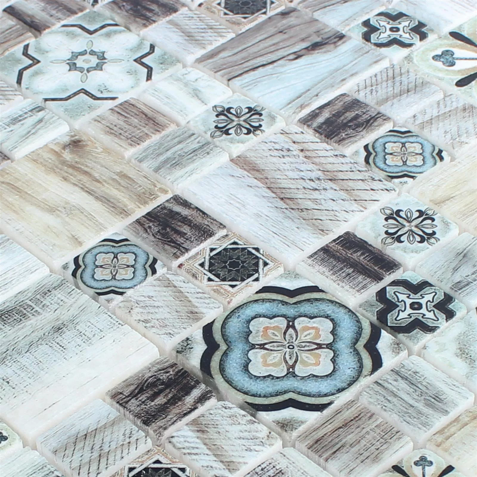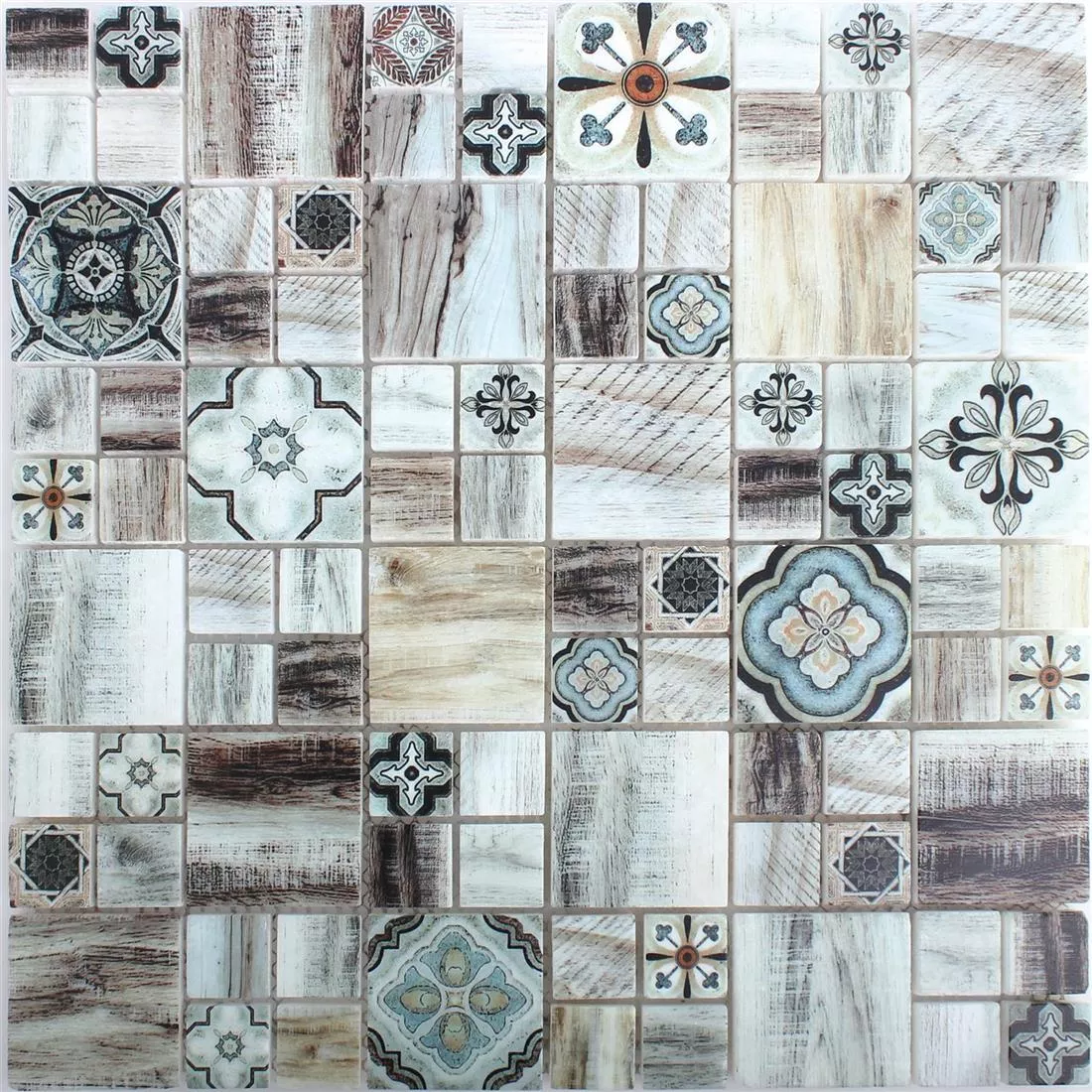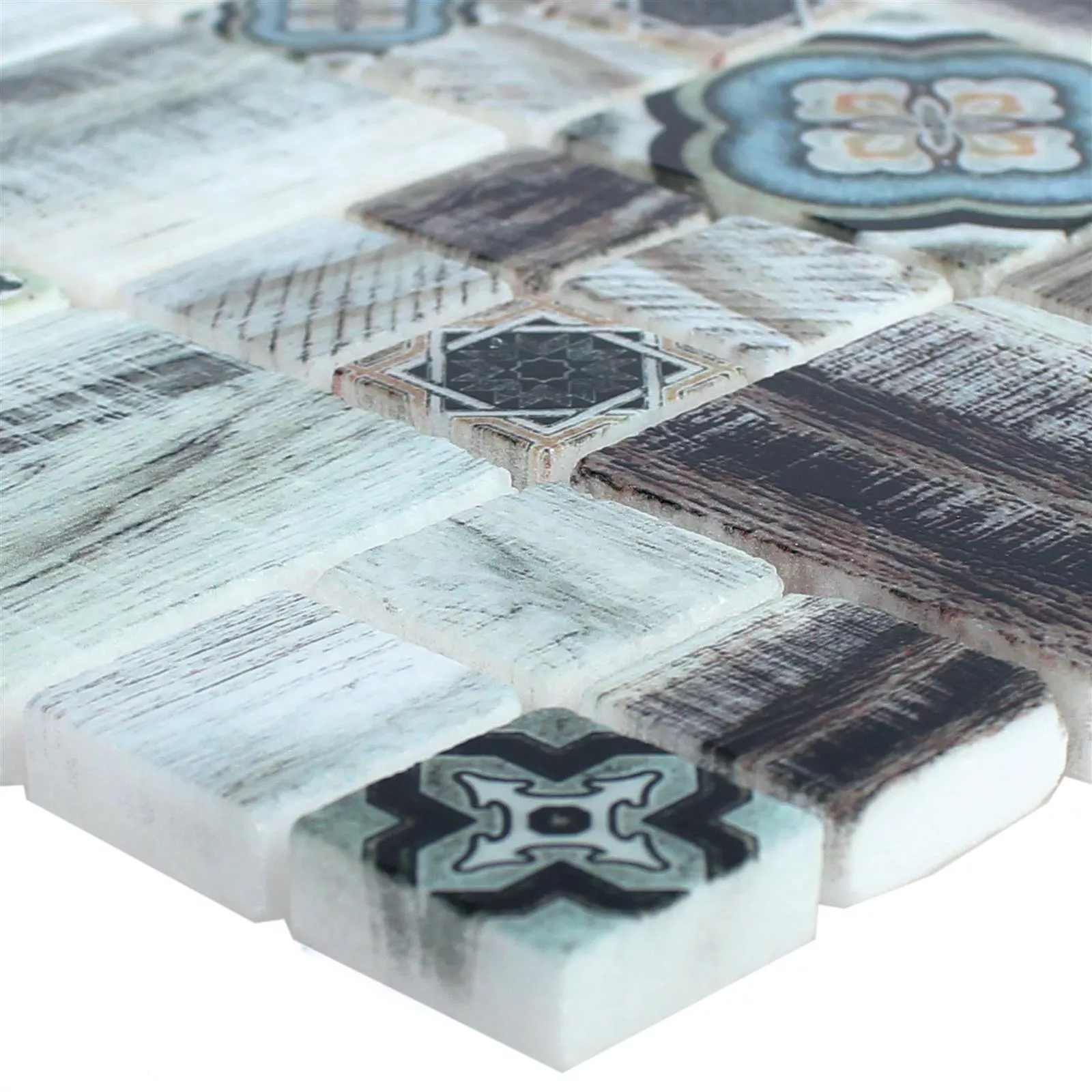 When it comes to the color of the Portland mosaic, you can choose between a timelessly simple variant in shades of gray and one in light brown. The matt surface of the tiles underlines the wood look of the pattern and creates a warm atmosphere. In the brown color scheme, blue accents on individual tiles add a visual highlight.