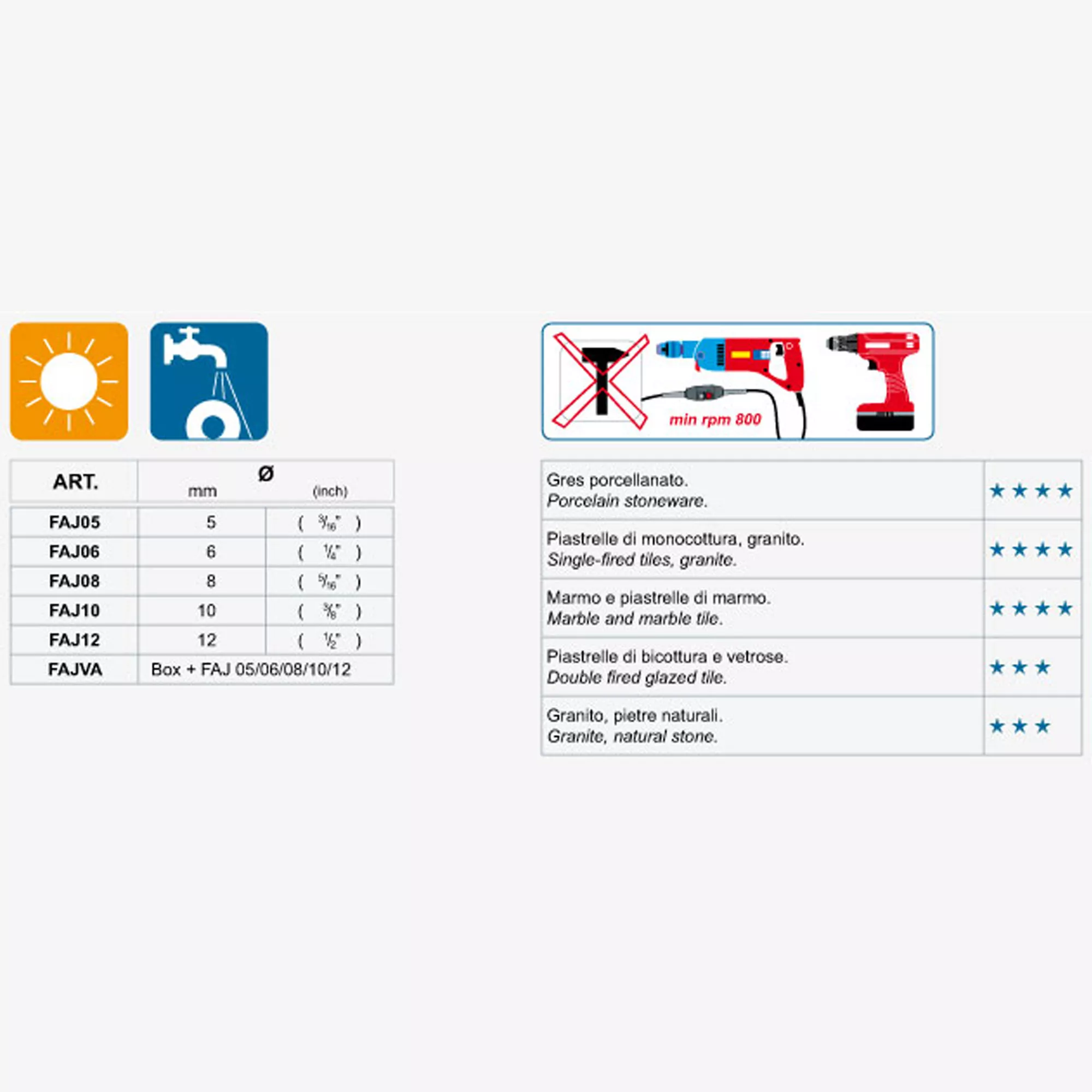 If you want to use the diamond core bit, you need a drill with at least 800 rpm or more. The Mondrillo diamond drill bit is available in 5 different sizes. The customer can choose between diameters 5, 6, 8, 10 and 12 mm. Diamond tools like this are considered particularly hard and are designed for a wide variety of jobs. While this diamond tool is suitable for dry drilling, there are other tools that can be used for wet drilling. When buying a drill bit and a diamond tool, you should pay attention to high quality and flawless workmanship. The tool presented here should be operated with a suitable or compatible drill.