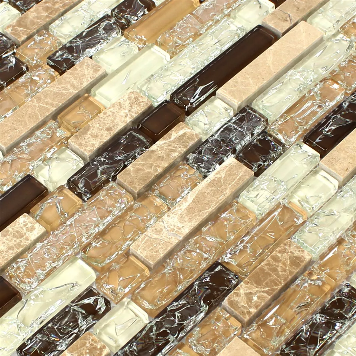 The modern tile series Malawi in the color Emperador Mix offers a particularly glittering effect as an effect mosaic thanks to the combination of broken glass with natural stones as soon as rays of light hit these mosaic tiles. The trendy natural stone mosaic is polished in all parts and therefore very easy to care for. The glass mosaic is made from pure cullet glass, making the Malawi mosaic tiles a visually appealing and eco-friendly solution for all walls in the home. Because the high-quality natural stone mosaic is not only an eye-catcher in the bathroom or in the hallway. The ingeniously designed glass mosaic, which is available in different colours, conjures up a touch of luxury in every room in the house, as the glass stones shine like diamonds.