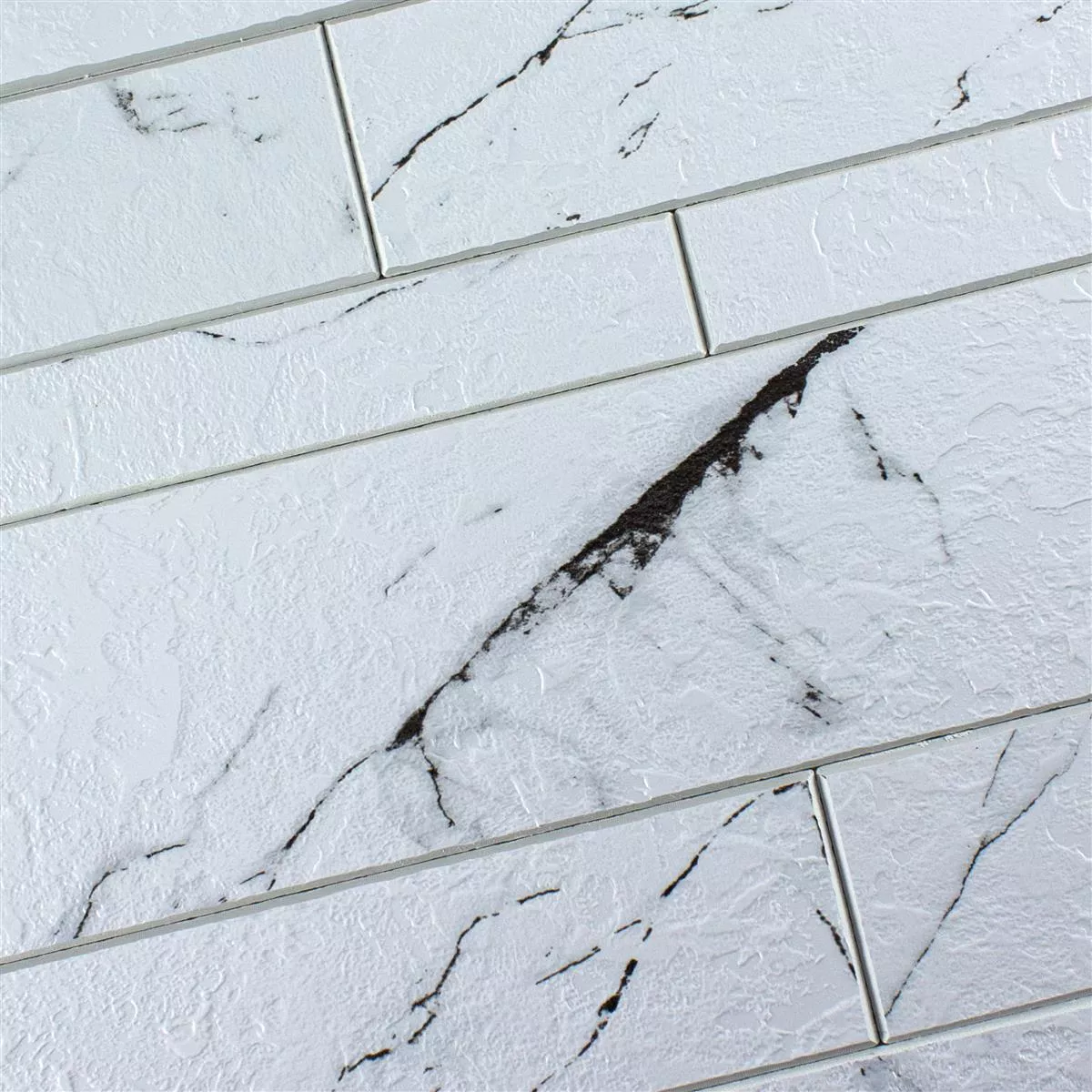 The Lewis self-adhesive mosaic tiles are a modern option for interior wall design such as living rooms, kitchens and bathrooms. The tiles have an elegant stone look in a black and white combination that creates a contemporary look.