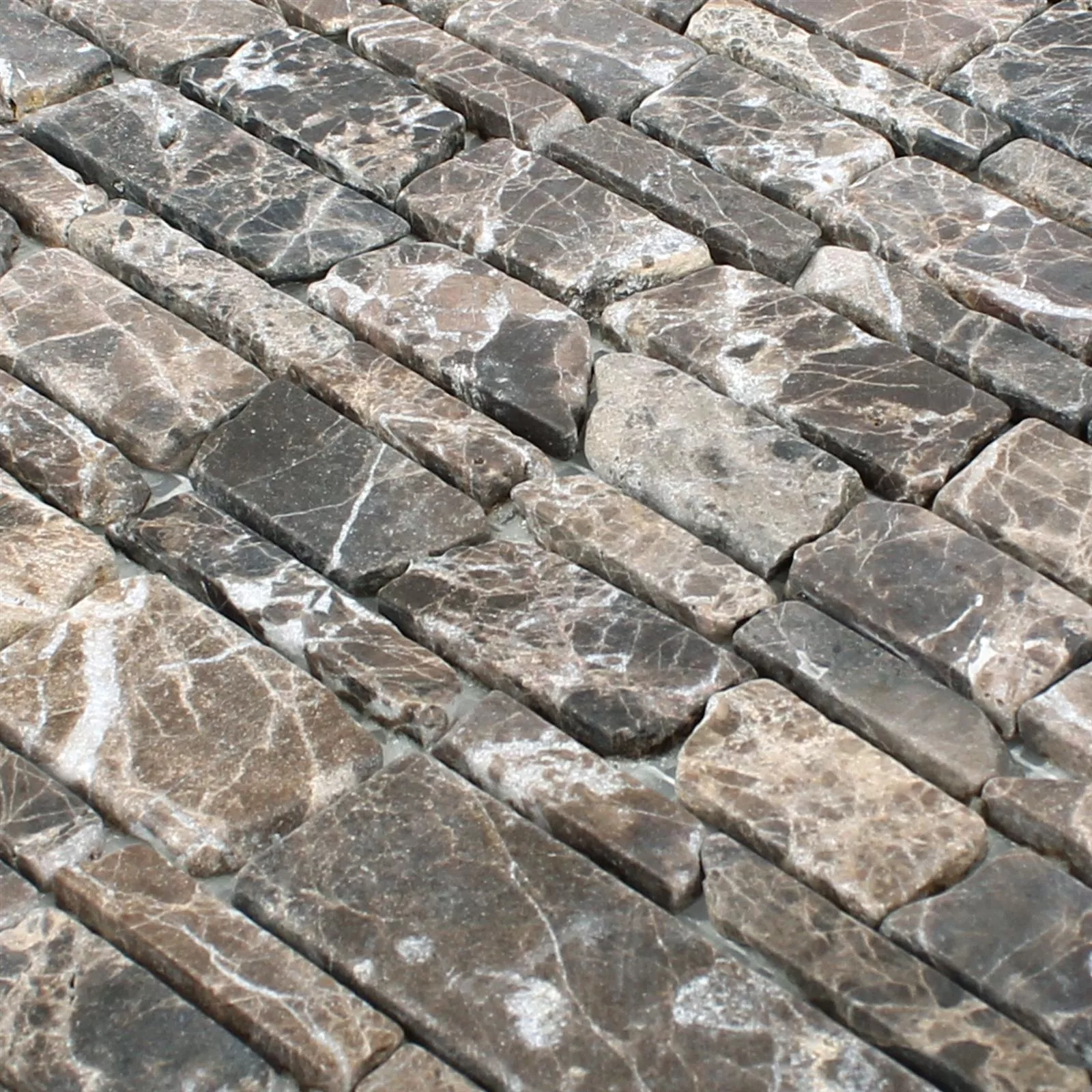 The small marble stones on the mosaic tiles are on a metal base. The stones are very uneven from 25 to 105 mm long x 15 x 7 mm. The mosaics are on a mat measuring 27.5 x 30 cm. The base has a thickness of 4 mm. The surface is brushed. Similar to natural tiles, they have a matt appearance. The bathroom tiles never look boring, as they offer exciting contrasts through the inclusions and fine lines as well as the uneven mosaics.