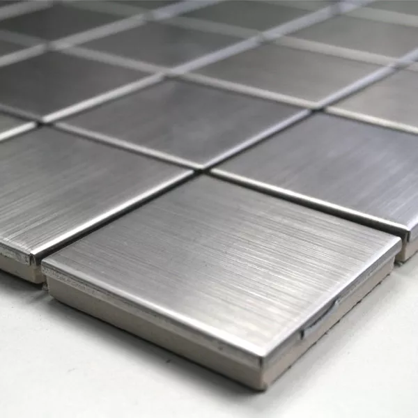 This noble, high-quality stainless steel mosaic is ideal as a kitchen mirror or for setting accents in the entire living area. The individual stainless steel plates are attached to a ceramic carrier, which in turn is glued to a fiberglass mat. The stainless steel mosaic has a matt - brushed surface finish. The stone format of the mosaic is 48x48x8mm, the entire mosaic mat has a size of 30.5x30.5cm.