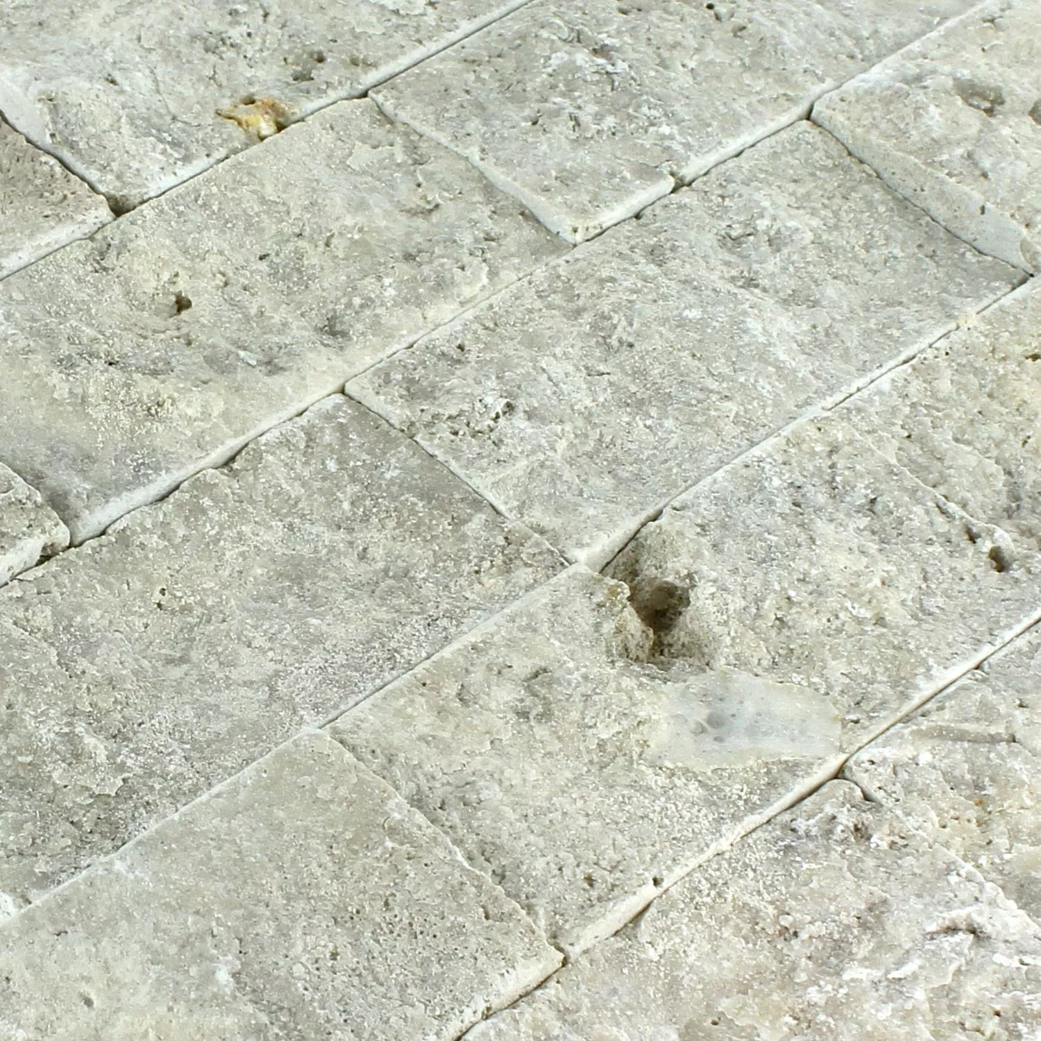 Like all natural stone tiles, the mosaic tiles are easy to care for, so that even years later they look just like they did on the first day. Natural stone tiles are therefore the perfect alternative to all wallpaper and wood paneling. They are a good investment in any home. The beautiful mosaic tiles are often laid in new buildings. But they can also be retrofitted in all older buildings within a short time, so that these natural stone tiles also ensure a pleasant living atmosphere in the old building. The natural stone tiles model Sumba Silver Brick can also be optimally combined with the other color nuances of the Brick series, so that sub-areas can be subtly separated from each other, especially in large rooms. Travertine tiles present a timelessly elegant style of living on every wall, to which both designer furniture and country house furniture and many other pieces of furniture fit perfectly.