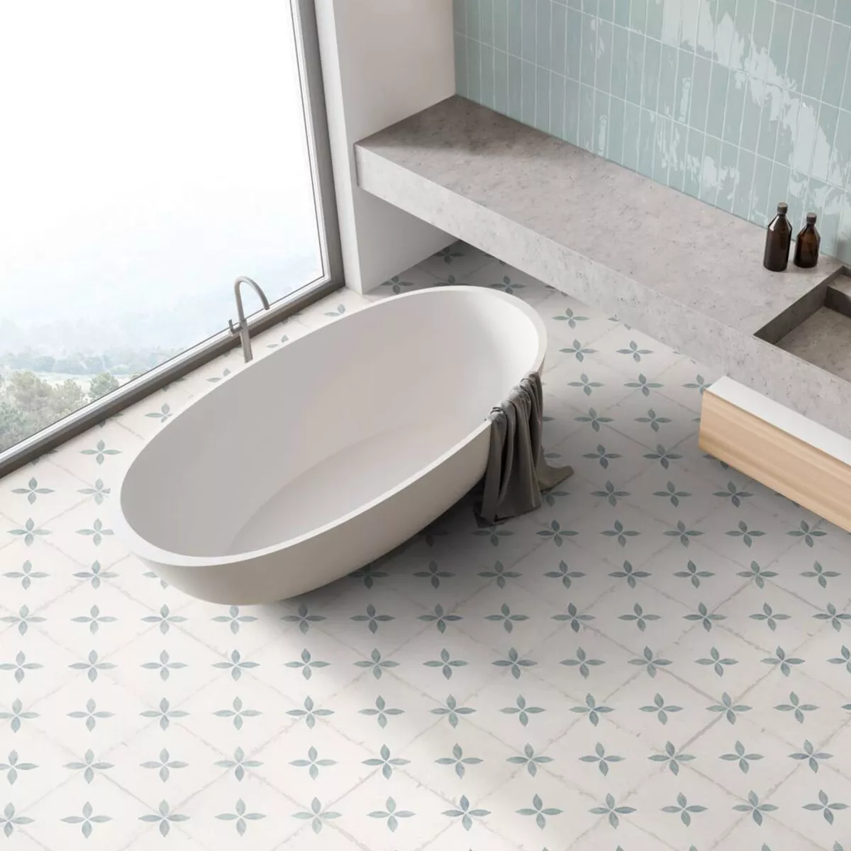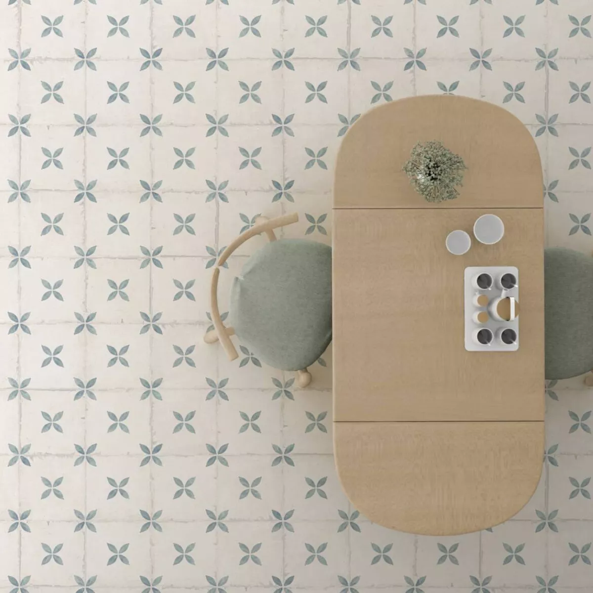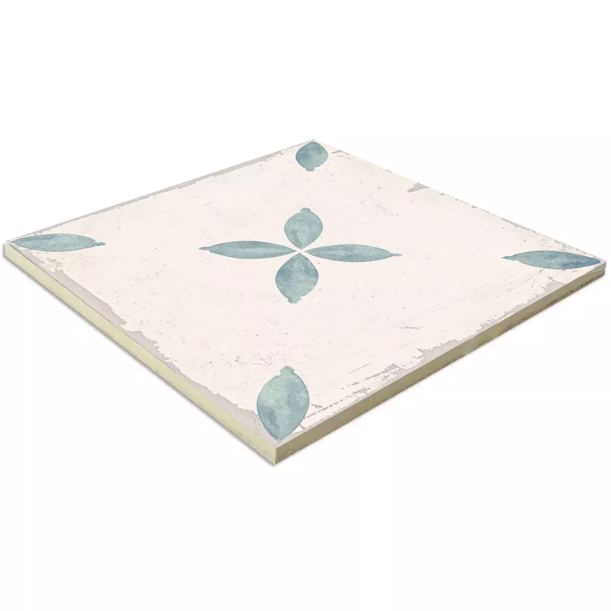 This high-quality porcelain stoneware floor tile from the renowned Pelin tile collection is characterized by its versatility and allows you to enhance many rooms in your house simultaneously. Whether in the kitchen, bathroom, conservatory, hallway, or living room – the light blue and cream-colored floor tile looks great in any room.