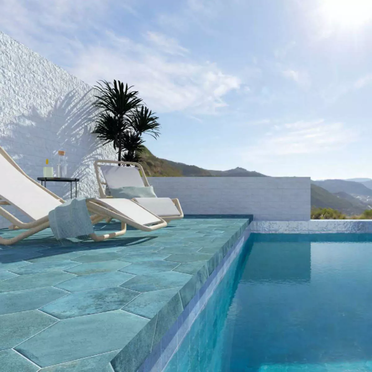 Give your swimming pool, pool or bathroom a unique look with these high-quality Palencia Turquoise Hexagon tiles. The combination of functionality and aesthetic design makes them the ideal choice for demanding design projects.