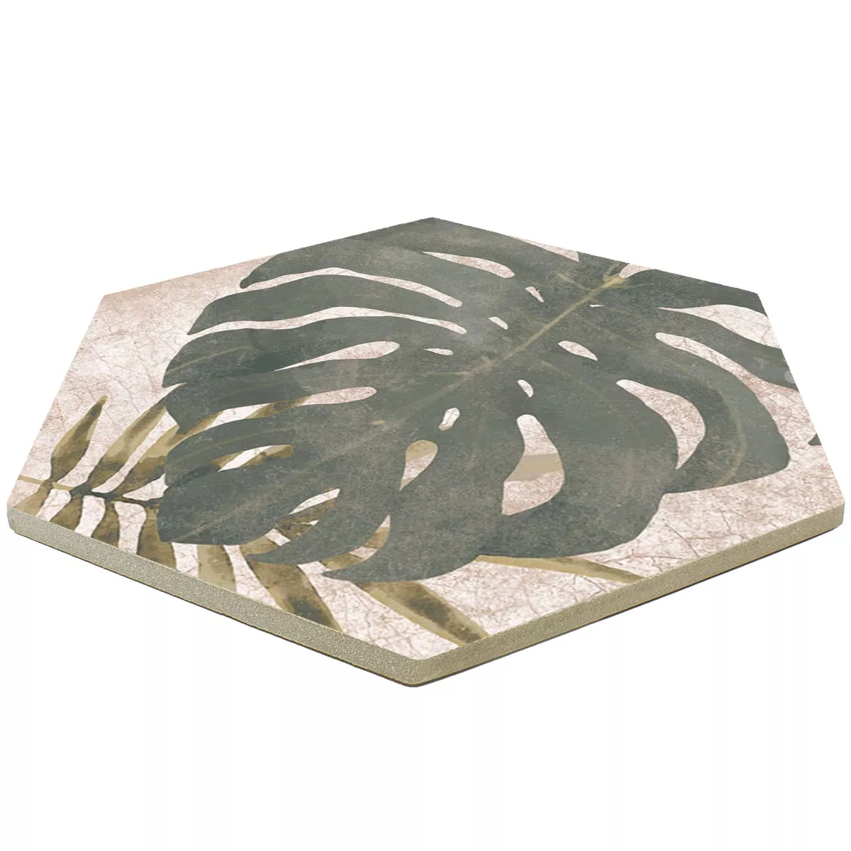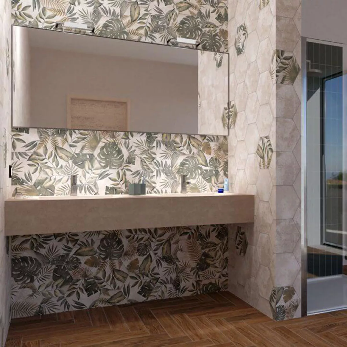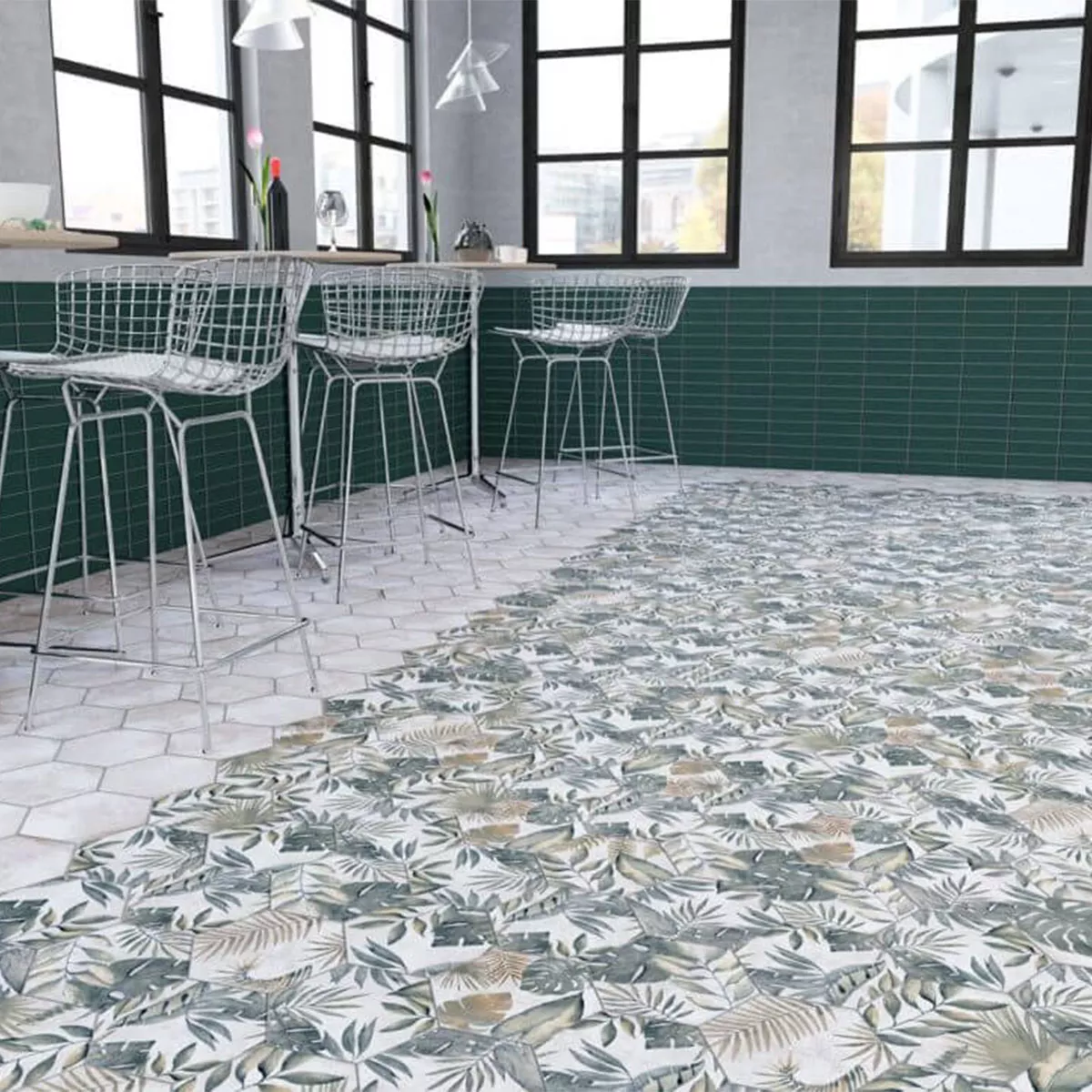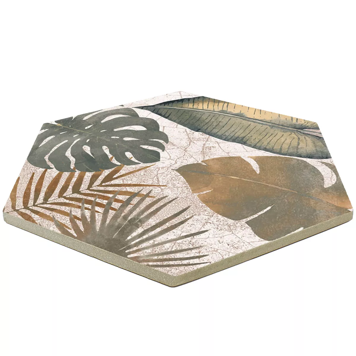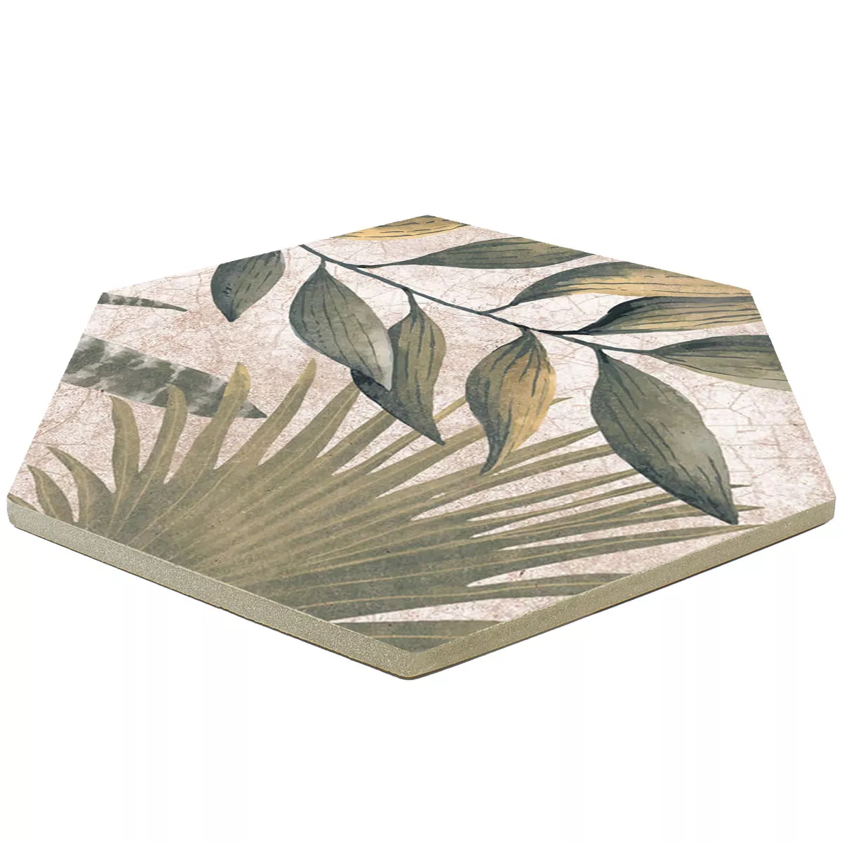 The striking hexagon format combined with the subtle floral decor gives your walls and floors a unique aesthetic. The tiles are available in a size of 22.5x25.9cm and are available in the colors green and beige, which create a harmonious and calming ambience.
