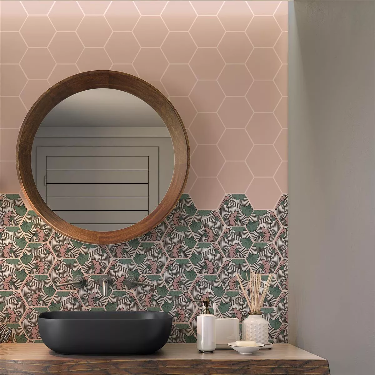 The “Modena Hexagon Decor 1” porcelain stoneware tiles combine style and functionality. With a thickness of 10mm, they are robust and are ideal for wet areas, showers, bathrooms, kitchens, living rooms and indoor areas. The matt surface gives the tiles a timeless appearance, while the R10 slip resistance ensures safety.
