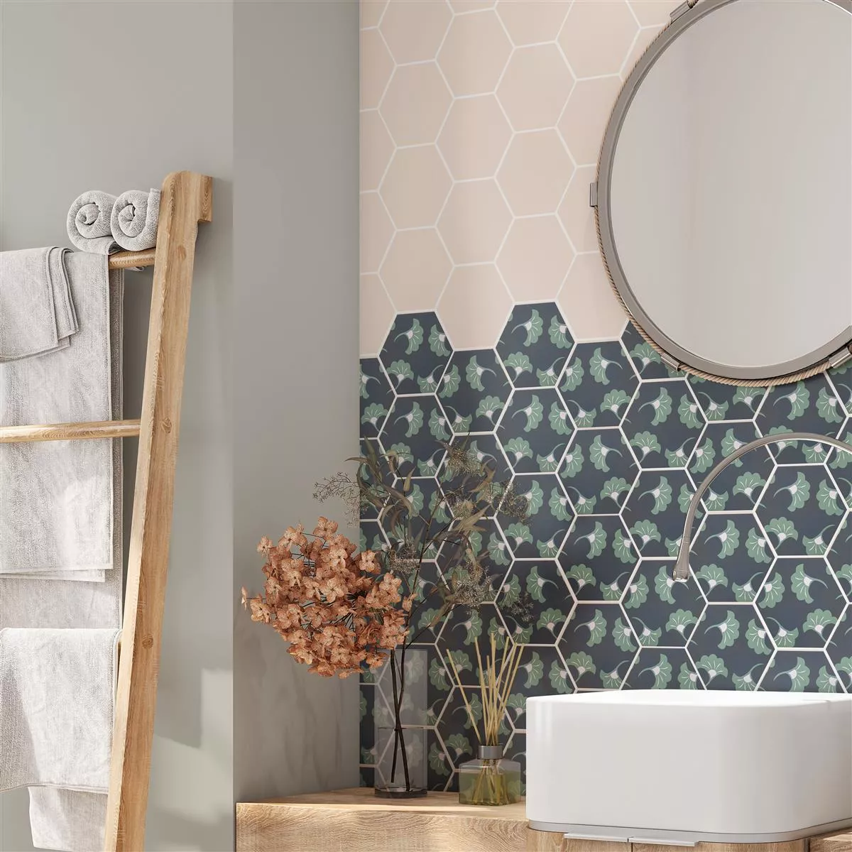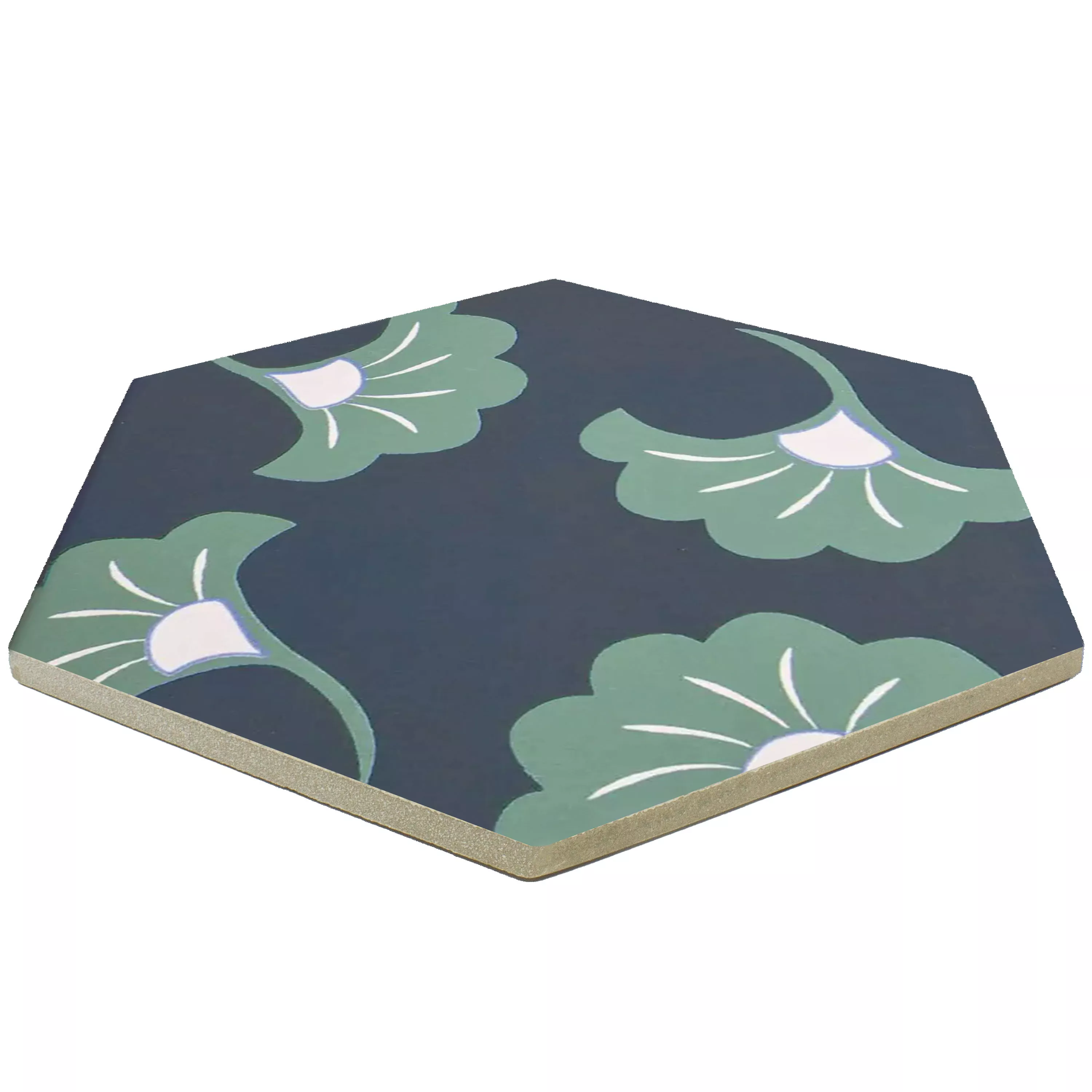 The “Modena Hexagon Decor 3” porcelain stoneware tiles combine art and functionality. With a thickness of 10mm, they are ideal for wet areas, showers, bathrooms, kitchens, living rooms and indoor areas. The matt surface and the ornamental motif in blue and green give the tiles a unique aesthetic.