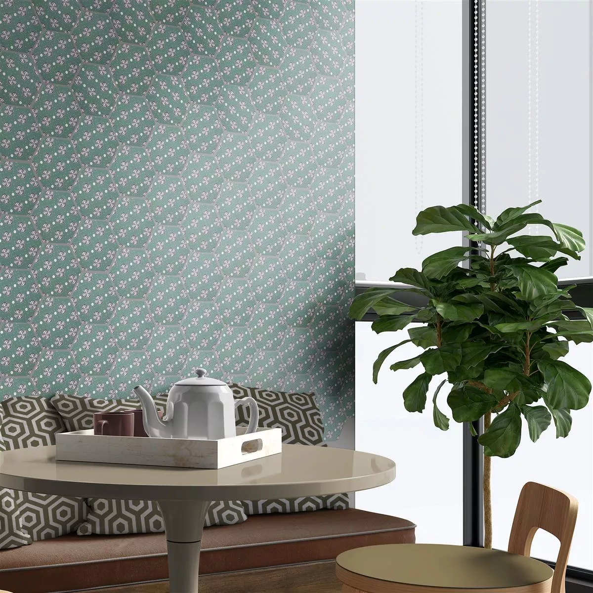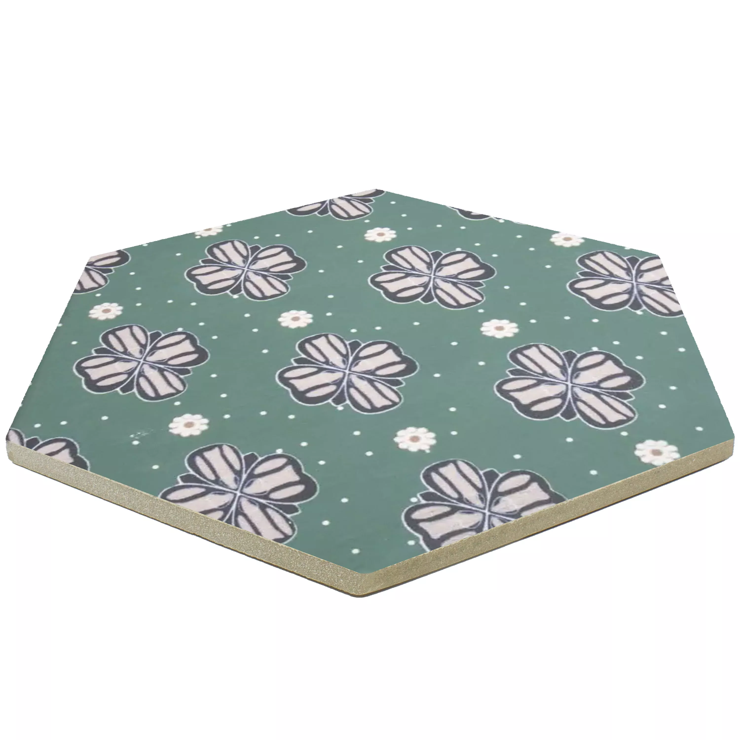 The “Modena Hexagon Decor 7” porcelain stoneware tiles combine impressive design with high functionality. With a thickness of 10mm, they are perfect for wet areas, showers, bathrooms, kitchens, living rooms and indoor areas. The matt surface, in an attractive green with floral ornaments, gives the tiles a timelessly elegant appearance.