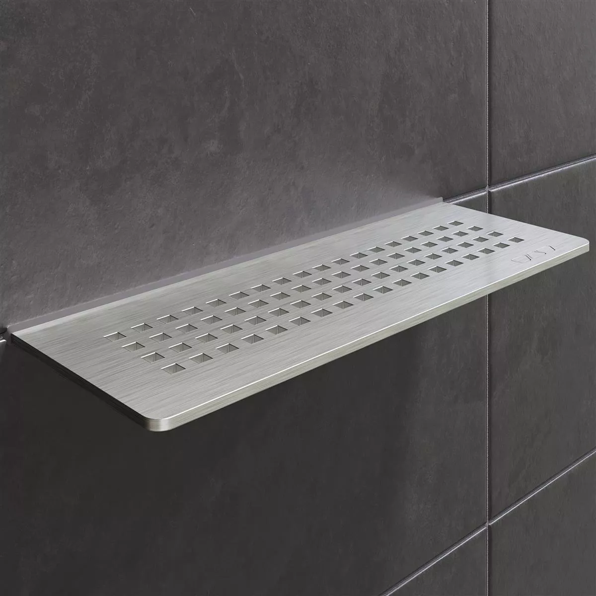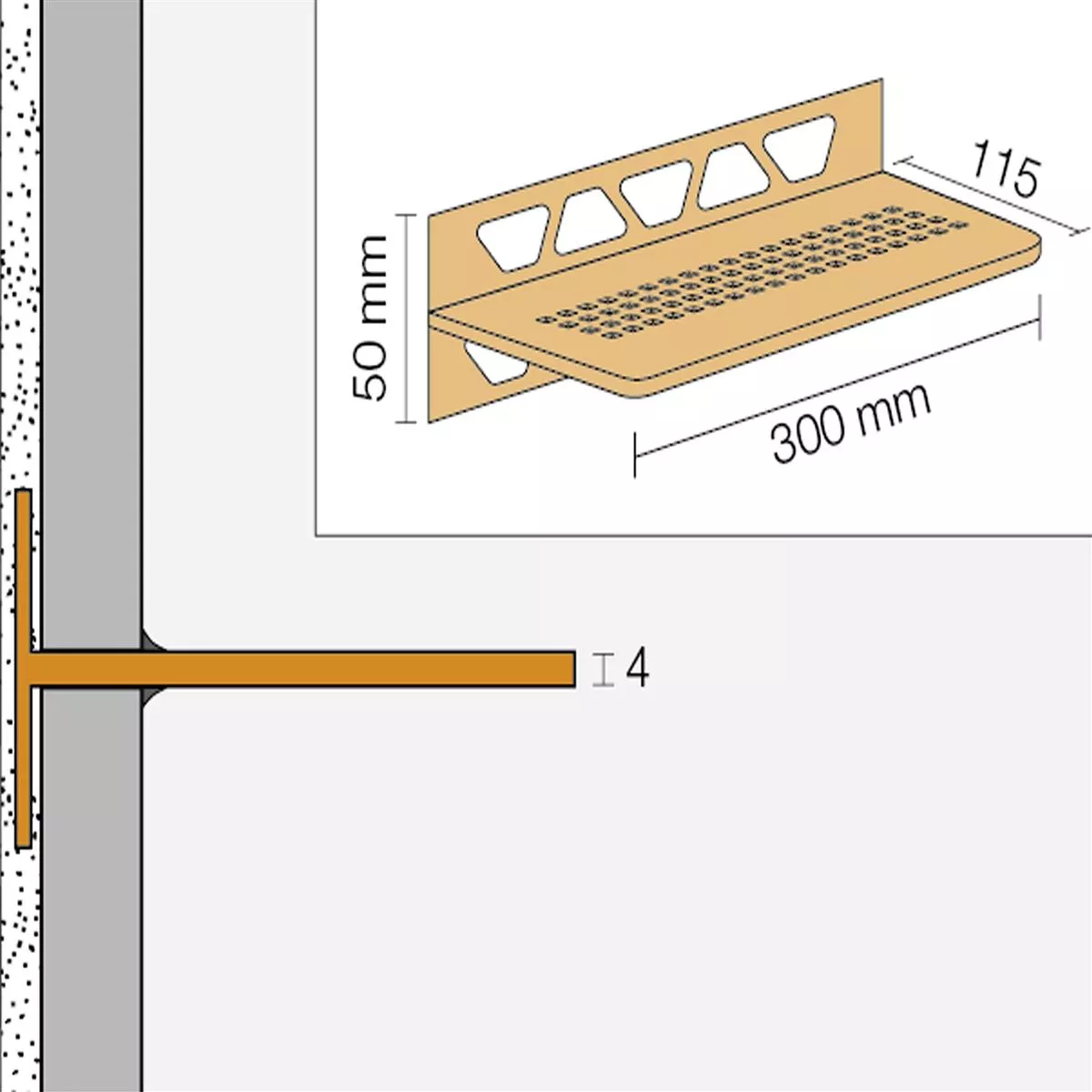 Rectangular wall shelf Whether in the bathroom or kitchen: The rectangular Schlüter-SHELF-W shelf can be used anywhere on the flat wall area where you are laying your tiles. Thanks to trapezoidal perforated mounting legs, the shelves are extremely stable and resilient, but at the same time they also impress with their modern look. You can not only choose between five attractive designs, but also between brushed stainless steel and aluminum, the latter of which is powder-coated in a popular TRENDLINE color or a MyDesign RAL color.