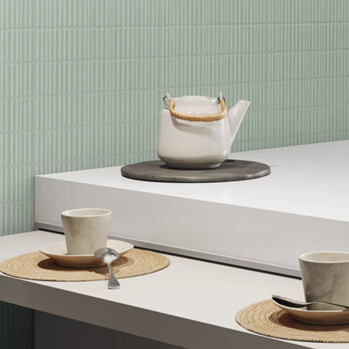 The special feature of these tiles lies in the relief design, which adds a subtle texture to any room and provides a unique visual experience. The glazed surface reflects the light and gives the tiles a vibrant shine that brightens and enlarges your rooms.